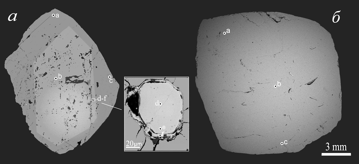В этом топазе выявлено микровключение циркона с вариациями содержания HfO2 0.64–2.35 мас. % и эмпирическими формулами состава: на участках d – (Zr0.99Hf0.01)[SiO4] – в центре зерна; e – (Zr1.0Hf0.01)[SiO4] – на периферии его; f – (Zr0.97Hf0.02)[SiO4] – в участке «зоны обрамления».