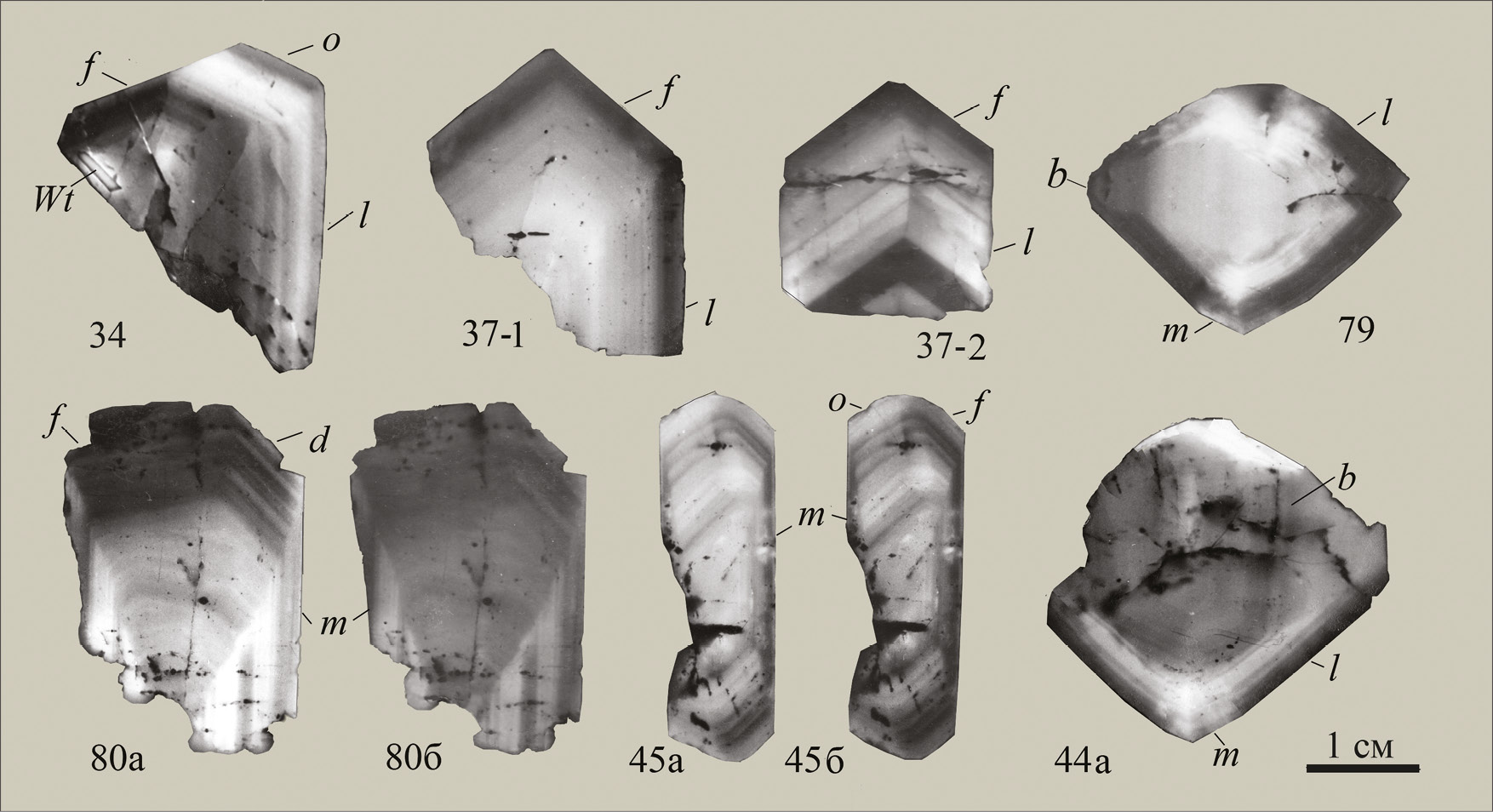 В топазе № 34 состав более излучавшей предпоследней светлой зоны роста призмы o{111} характеризуется формулой (Al1.98Ti0.01Fe0.01)2[SiO4]F1.11(OH)0.89, а топаз малоактивной периферической зоны призмы f{011} – формулой (Al1.98Fe0.01Ti0.01)2[SiO4]F1.06(OH)0.94. В топазе № 37-1 интенсивность излучения постепенно уменьшалась от внутренних светлых зон к периферическим малоактивным темным зонам призм l{120} и f{011}, где наименее активна была зона роста призмы l{120}.