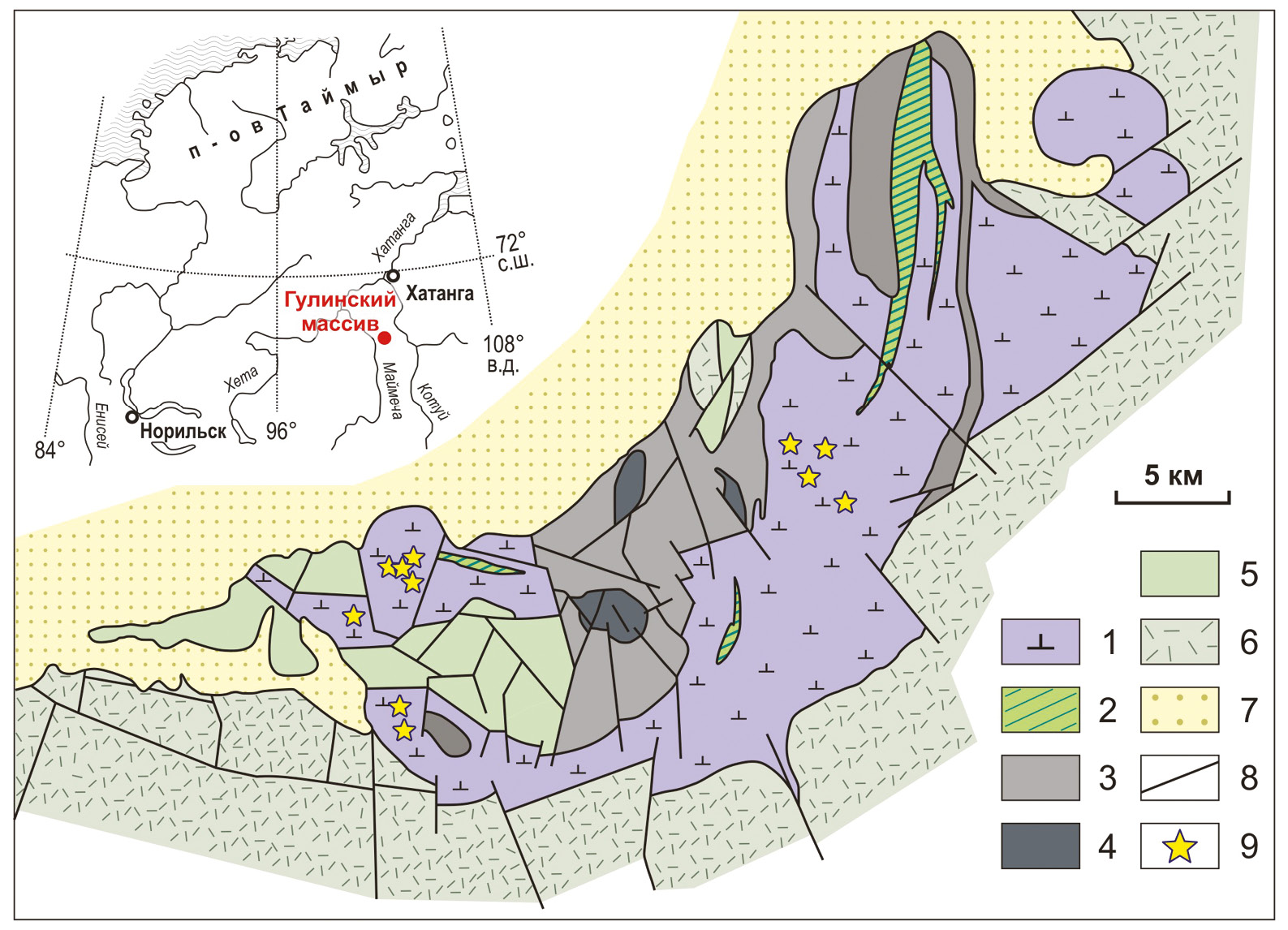 1 – дуниты; 2 – клинопироксениты; 3 – щелочные породы; 4 – карбонатиты; 5 – меймечиты; 6 – пермо-триасовые вулканические породы; 7 – мезо-кайнозойские и четвертичные отложения Енисей-Хатангской впадины; 8 – тектонические нарушения; 9 – места отбора образцов исследованных дунитов.