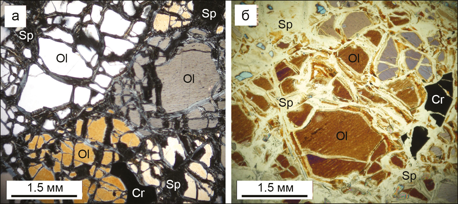 Ol – оливин, Cr – хромшпинелид, Sp – серпентин. Проходящий свет с анализатором (а) и поляризатором (б).