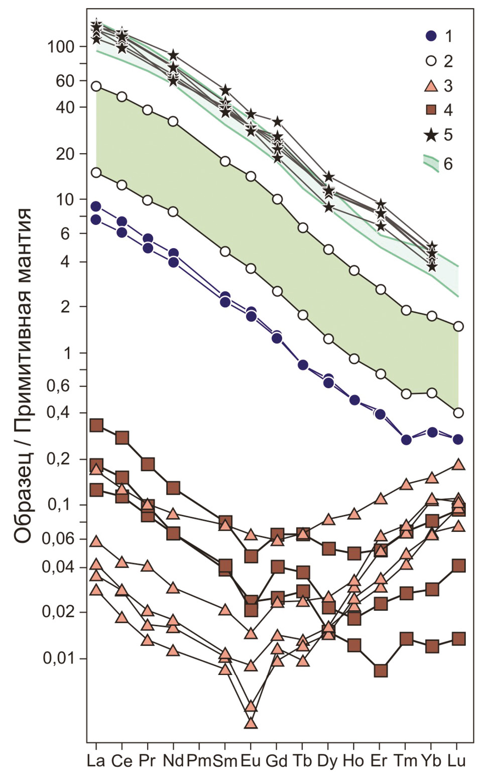 Рис. 3. Спектры РЗЭ в дунитах Гулинского массива, нормализованные к примитивной мантии (McDonough, 1992).