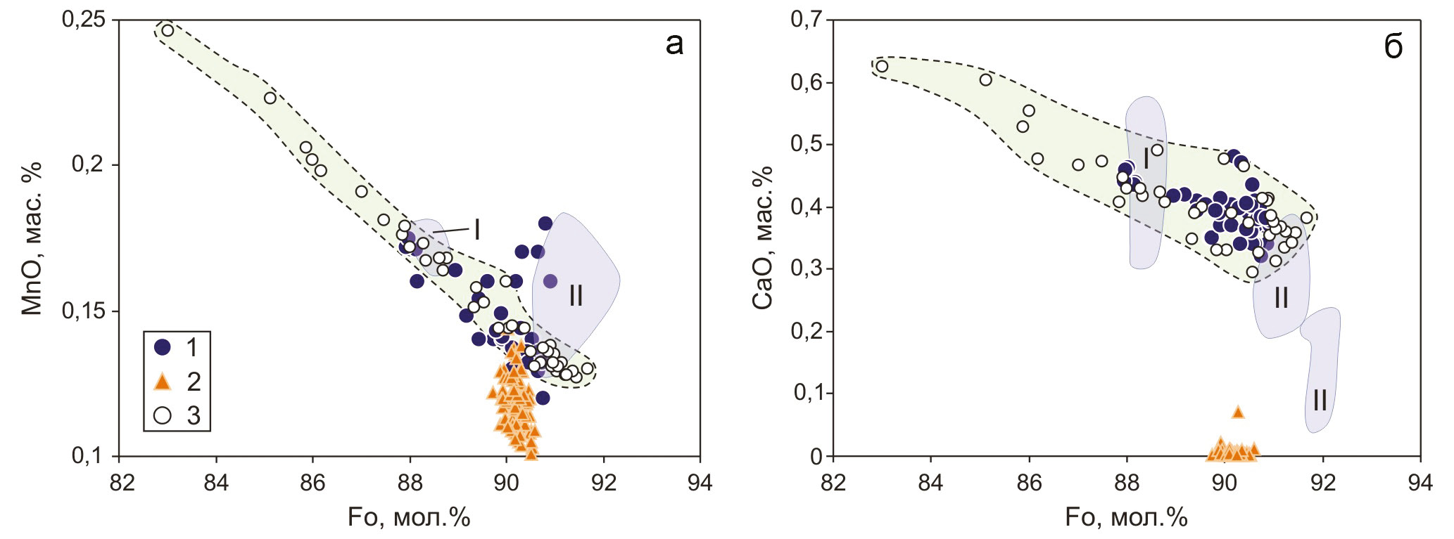 а – оливин из дунитов Гулинского (1), ультрабазитов Чаган-Узунского (2) массивов и меймечитов Гулинского массива (3). б – поля составов оливина из дунитов Гулинского массива по данным: I – (Соболев и др., 2009), II – (Pink, 2008). Рисунок построен на основе оригинальных данных с использованием информации из работ (Соболев и др., 2009; Симонов и др., 2021; Pink, 2008).