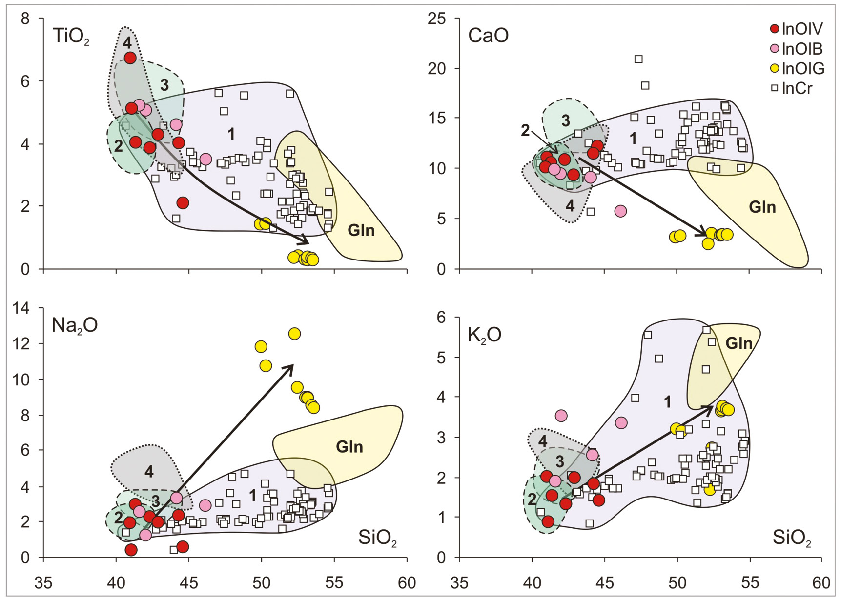 GIn – glass composition of multiphase inclusions in olivine from dunites of the Guli massif. For other symbols, see Fig. 6.