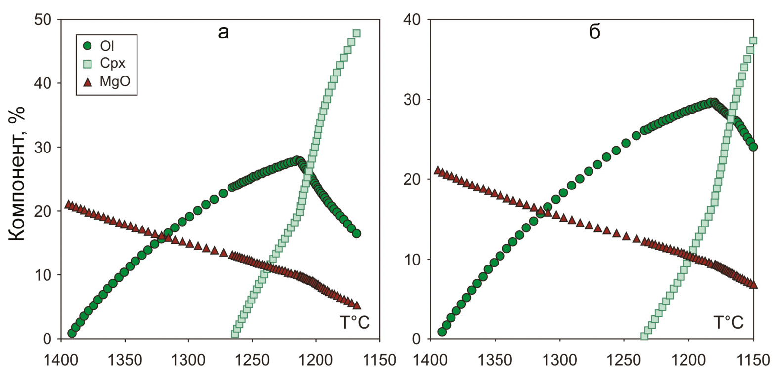 Axis y shows the changes in the content of minerals (Ol – olivine, Cpx – clinopyroxene, %) and MgO (wt. %) in melt upon decreasing temperature.