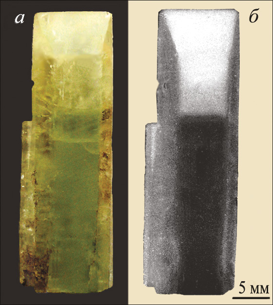 Из пегматита этого карьера столбчатый кристалл желтовато-зеленоватого берилла длиной 4 см в субпараллельном сростке с меньшим желтоватым бериллом передан нам С.В. Ворожевой в 1982 г. Для исследования кристалл распилен по ~[0001]. Оба индивида берилла в сечении зонально-секториальны с более светлыми зонами роста пинакоида (рис. 13а), что контрастно проявилось и на нейтронно-активационной радиографии (Попова, 1995) с постепенным увеличением интенсивности b-излучения (рис. 13б) из-за примеси Cs2O (0.47 мас. %) в пирамиде роста пинакоида (табл. 2, обр. Св-82, ан. 1b).