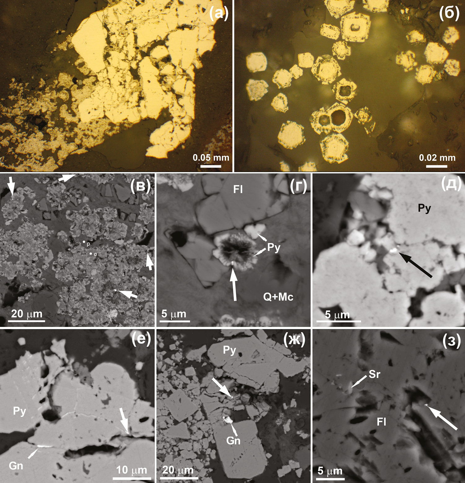 Рис. 2. Первичные штокверково-прожилковые руды: а, б – основные морфологические типы пирита: а – брекчированный мелкозернистый с замещением тонкозернистыми агрегатами, б – тонкозернистые ка ймы вокруг субгедральных и атолловидных зерен; в–з – зерна золота (стрелки): в – в скоплении микроконкреций в ассоциации с галенитом, кварцем, флюоритом и роскоэлитом (точка p), г – в микроконкреции в ассоциации с эвгедральным пиритом; д – в интерстиции пирита; е, ж – в трещинах пирита в ассоциации с галенитом, з – во флюорите с включением целестина.