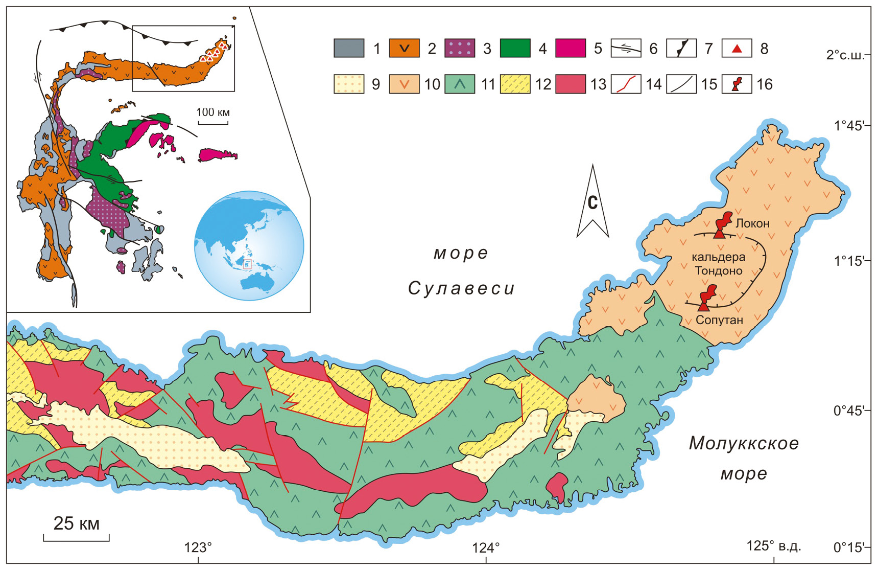 1 – четвертичные и неогеновые осадочные отложения; 2 – кайнозойские вулканические и плутонические породы; 3 – метаморфические породы; 4 – офиолитовые комплексы; 5 – континентальный фундамент; 6 – сдвиги; 7 – разломы; 8 – активные вулканы; 9 – четвертичные осадочные породы северо-восточной части острова Сулавеси; 10 – четвертичные вулканические породы (дациты, андезиты, базальты); 11 – эоцен-раннеплиоценовые риолиты, андезибазальты, базальты; 12 – эоцен-миоценовые осадочные породы; 13 – кислые и средние интрузивы, преимущественно граниты (эоцен-плиоцен); 14 – локальные разломы; 15 – прочие границы; 16 – изученные вулканы.