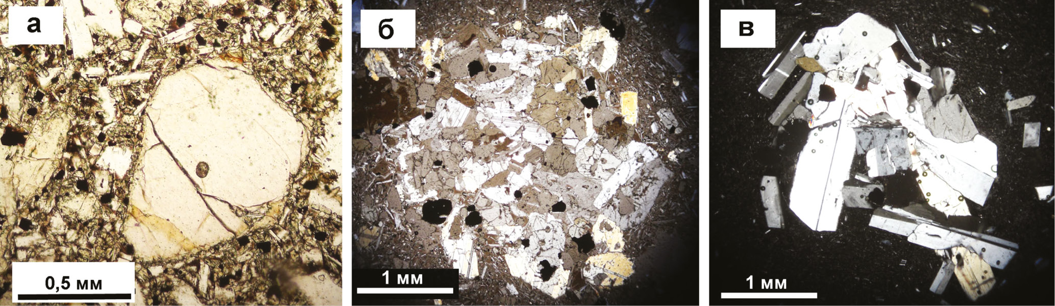 Рис. 2. Вкрапленники плагиоклаза в базальте (а), андезите (б) и даците (в).