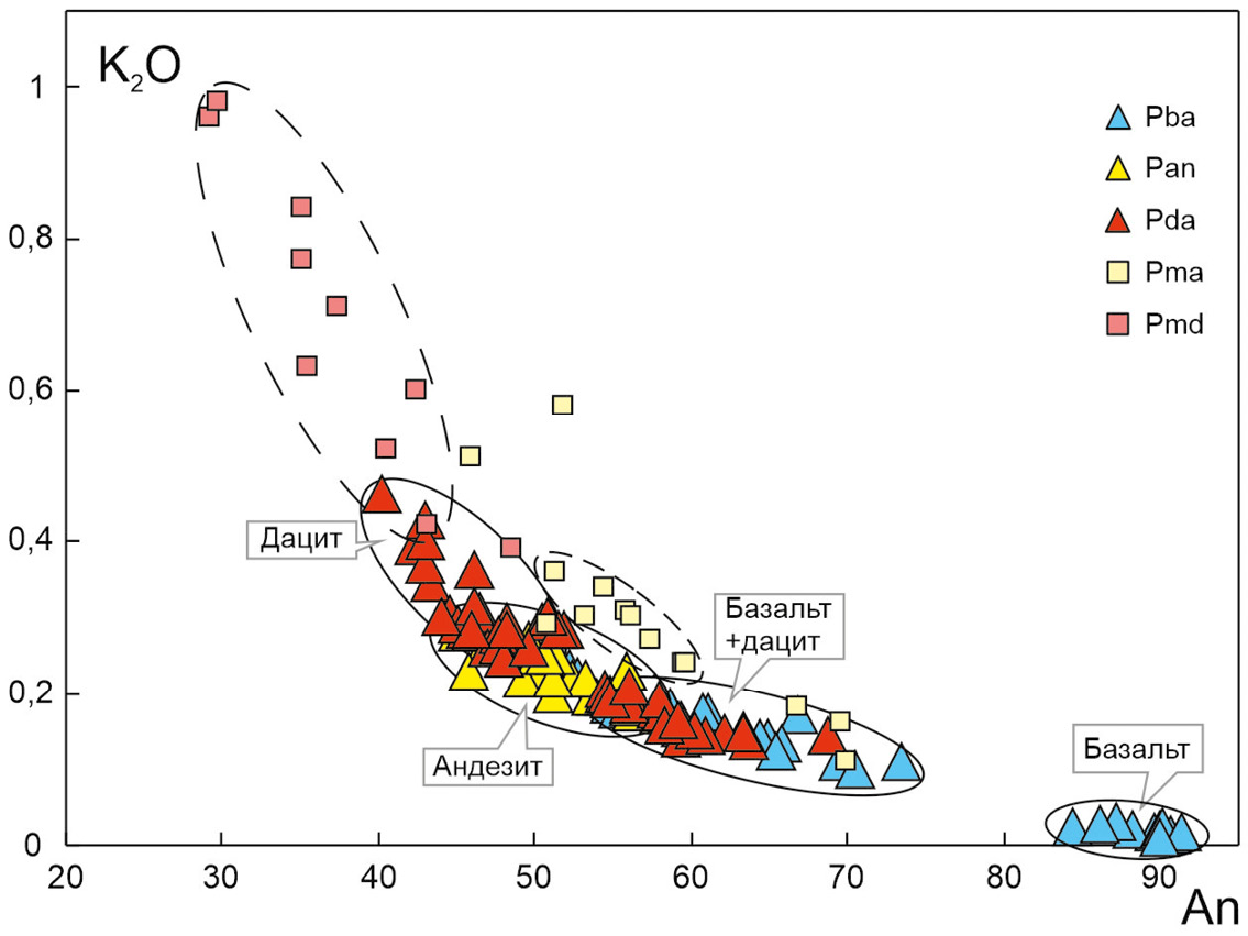 Судя по составу плагиоклазов из эффузивов, в их кристаллизации участвовали три типа расплавов, формировавших вкрапленники битовнит-анортита в базальтах и андезин-лабрадора в базальтах, андезитах и дацитах, а также микрокристаллики андезина в основной массе дацита.