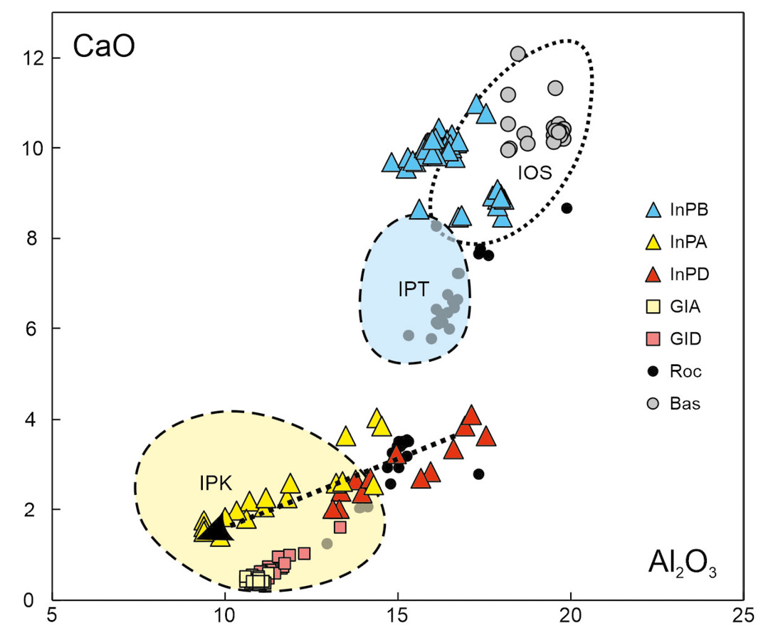 Относительно высокие содержания CaO и Al2O3 установлены в стеклах прогретых включений в плагиоклазе из базальта вулкана Локон. Учитывая состав стекол непрогретых включений в минералах из эффузивов вулкана Сопутан (Kunrat, 2017), подобные содержания характерны для базальтоидных магм вулканогенной структуры, в которую помимо отмеченных вулканов входит и кальдера Тондоно (рис. 1). Близкие повышенные содержания CaO и Al2O3 (рис. 11) характерны для стекол непрогретых включений в кристаллах плагиоклаза вулкана Толбачик (Добрецов и др., 2016).
