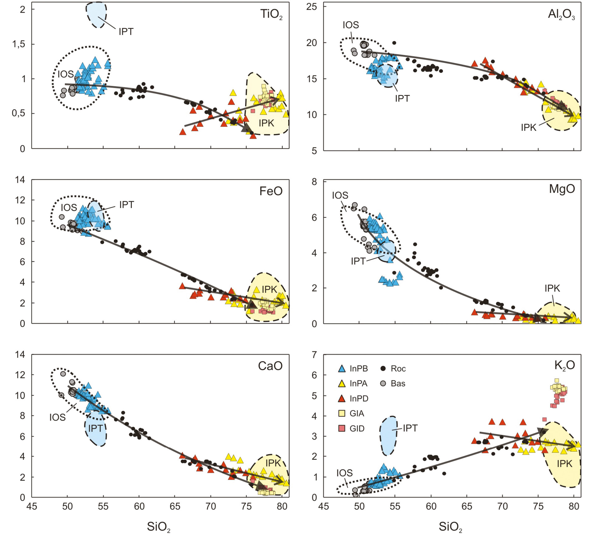 Вариационные петрохимические диаграммы позволяют выявить характерные особенности состава гомогенных стекол прогретых расплавных включений в плагиоклазе из эффузивов. По соотношению TiO2, Al2O3, FeO, MgO, CaO, K2O и SiO2 изученные включения образуют две группы «базитового» и кислого составов. Первая группа характерна для прогретых включений в плагиоклазе из базальтов вулкана Локон, перекрывается с составами стекол непрогретых включений в оливине из эффузивов вулкана Сопутан и тесно ассоциирует с непрогретыми включениями в кристаллах плагиоклаза вулкана Толбачик (Камчатка). Для второй группы (прогретые включения в плагиоклазе из андезитов и дацитов) характерны широкие вариации SiO2 (65–80 мас. %) с трендами падения содержаний Al2O3, FeO, MgO, CaO и K2O и роста содержания TiO2. Поля составов прогретых включений в плагиоклазе из андезитов острова Сулавеси для всех компонентов перекрываются с полями составов стекол непрогретых включений в плагиоклазе из андезитов вулкана Меньший Брат, Курильские острова (рис. 14), что служит дополнительным свидетельством достоверности наших результатов.