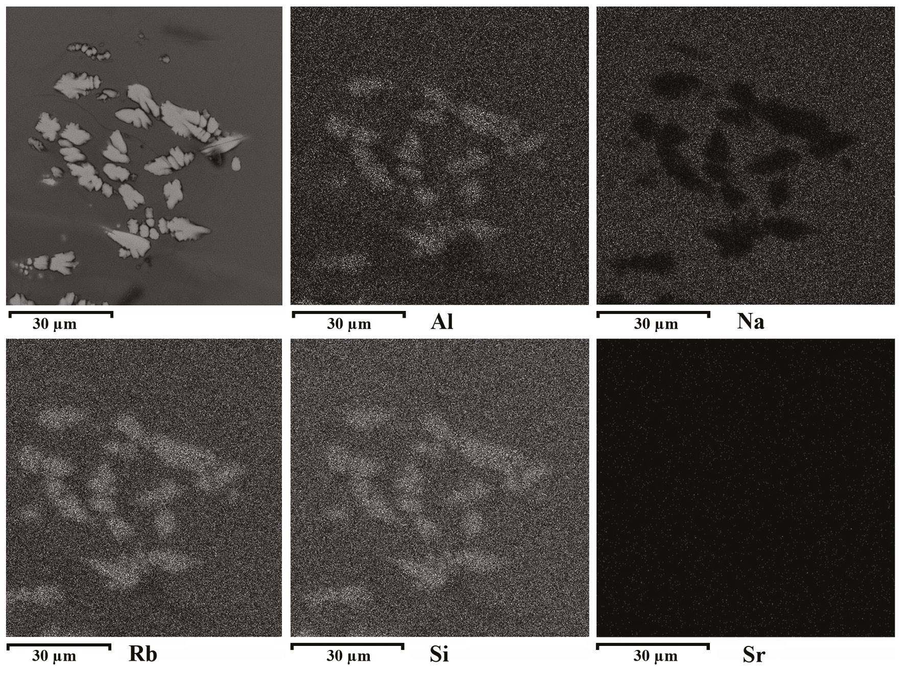 Fig. 2. BSE images of Rb aluminosilicate and distribution maps of Al, Na, Rb, Si and Sr.