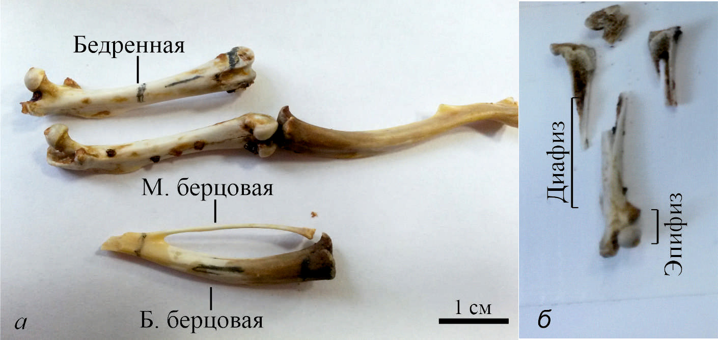 Рис. 1. Препараты костей для исследований: а – обезвоженные бедренные, большеберцовая и малая берцовая кости; б – бедренная кость после распила с указанием отделов трубчатой кости.