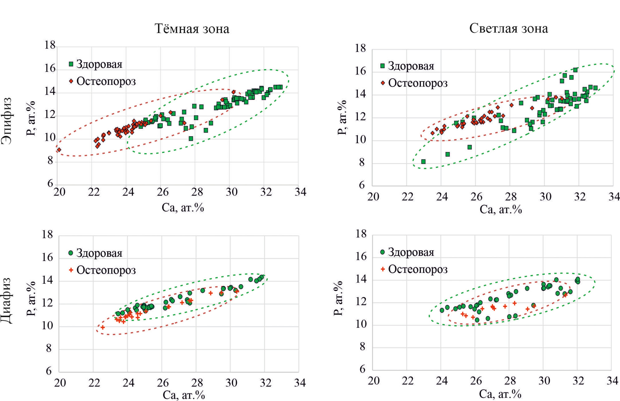 Характер концентрации Ca и P в гидроксилапатите закономерно связан с морфологией кости и ее зонами. В эпифизе, где процесс биохимического обмена протекает более интенсивно, особенно в частях, расположенных ближе к гаверсовым каналам (темные зоны), содержания и P, и Ca в гидроксилапатите патогенно измененных образцов ниже, чем в эталоне. Изменения в зоне диафиза протекают менее интенсивно, о чем свидетельствует содержание Ca и P в эталонной и остеопорозной костной ткани (рис. 3), при этом следует отметить, что при широком разбросе значений содержание Ca и P в больной кости оказывается ниже, чем в эталонной.