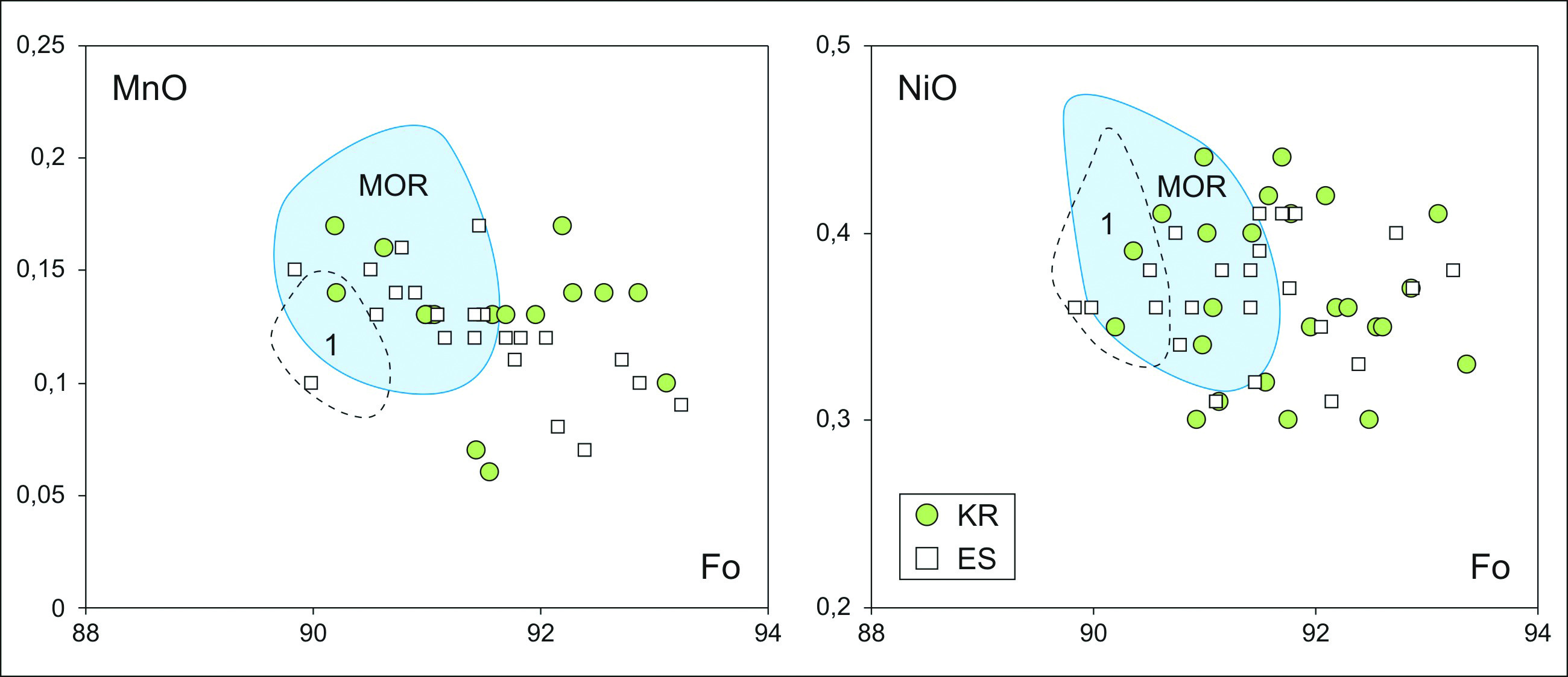 4. Fig. 3. Composition of olivines from ultramafic rocks of the Kurtushiba ophiolites (KR) and harzburgites of the Ospa massif (East Sayany) (ES) on MnO–Fo and NiO–Fo diagrams. Based on original data and materials from (Goncharenko, 1989; Simonov et al., 1999; Antsiferova, 2006; Rybakova, 2019). Compositional fields of olivines from harzburgites of: MOR – MAR and 1 – Chagan-Uzun massif (Gorny Altai). Fo – forsterite component.