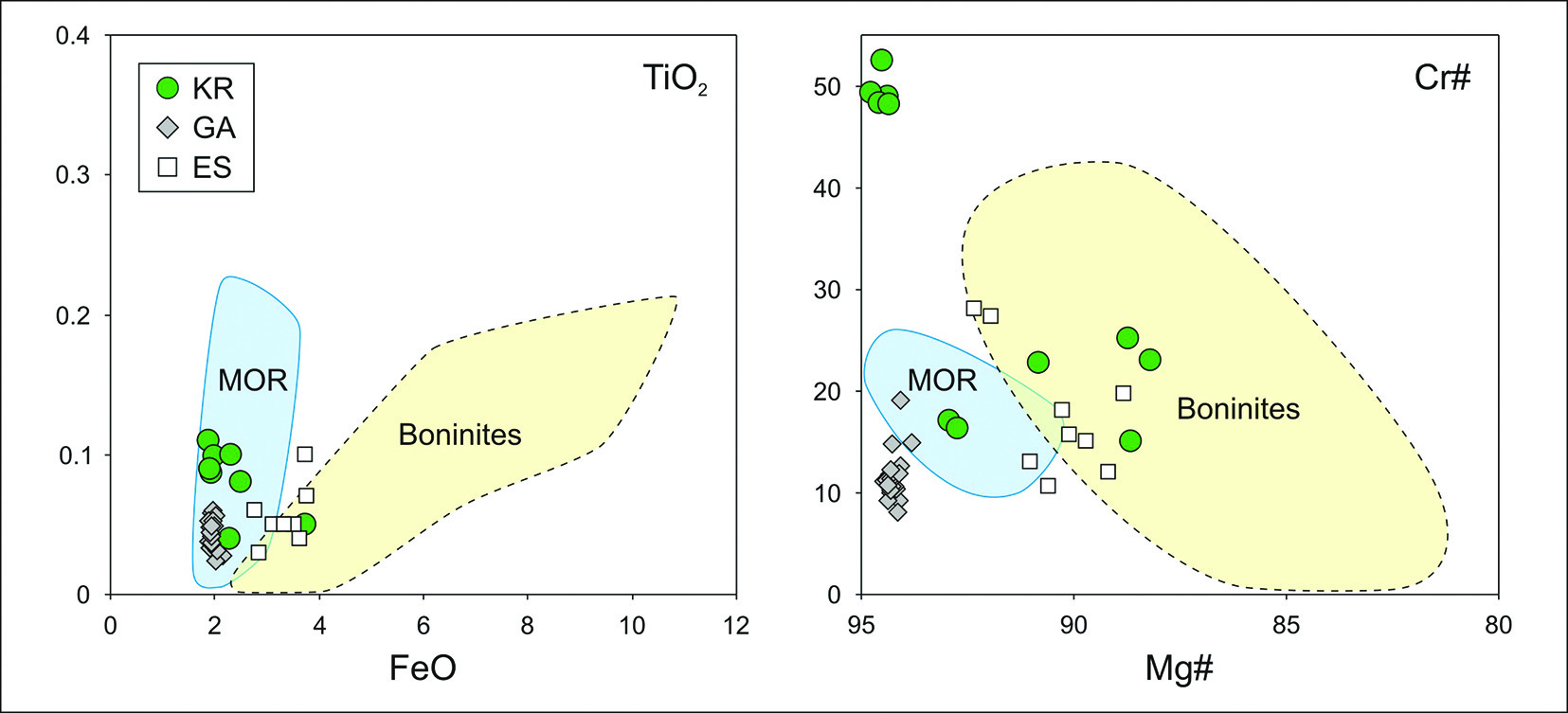 7. Fig. 6. Composition of clinopyroxenes from ultramafic rocks of the Kurtushiba ophiolites (KR), pyroxenites of the Chagan-Uzun massif (Gorny Altai, GA) and pyroxenites and wehrlites of the Ospa massif (Eastern Sayany, ES). Based on original data and materials from (Goncharenko, 1989; Simonov et al., 1994, 1999, 2009; Antsiferova, 2006; Brunally et al., 2006; Kotlyarov et al., 2018). Clinopyroxenes from MAR ultramafic rocks (MOR) and boninites of the Kurai ophiolites (Gorny Altai) (Boninites).