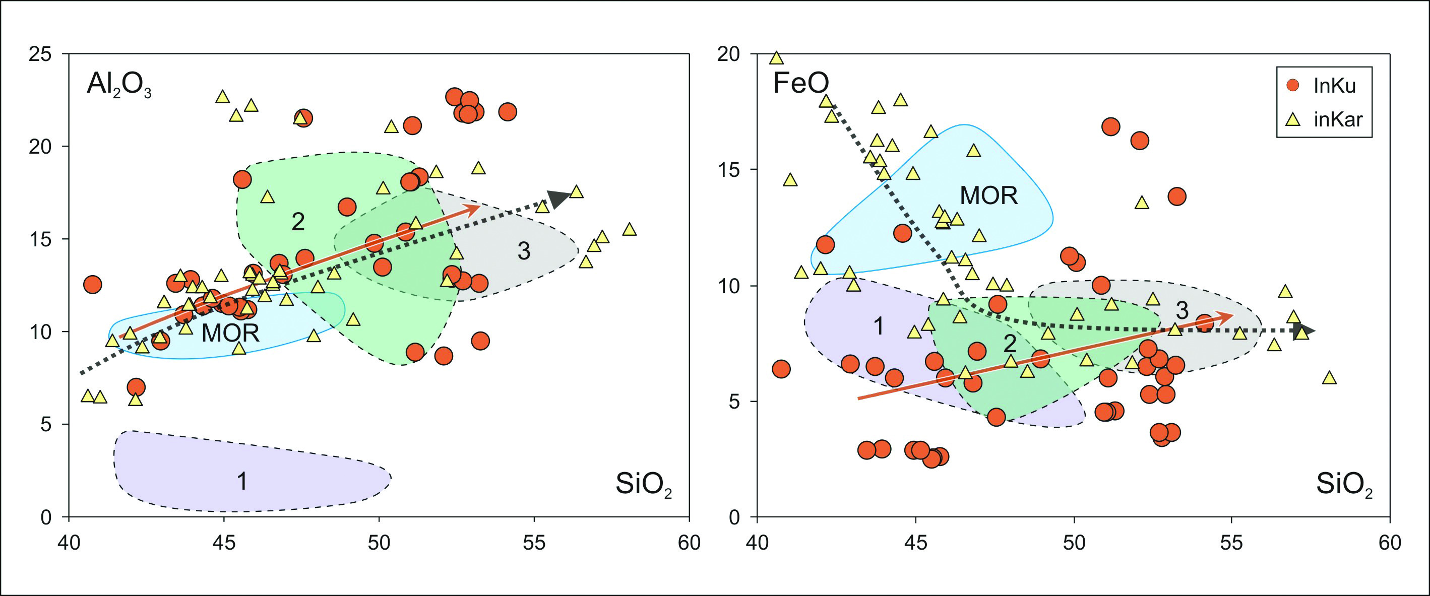 Рис. 10. Состав расплавных включений в хромшпинелидах из дунитов Куртушибинских офиолитов (InKu) и Карашатского массива (InKar) на диаграммах Al2O3SiO2 и FeOSiO2. Построено на основе оригинальных данных и материалов из работы (Петрология…, 1977).