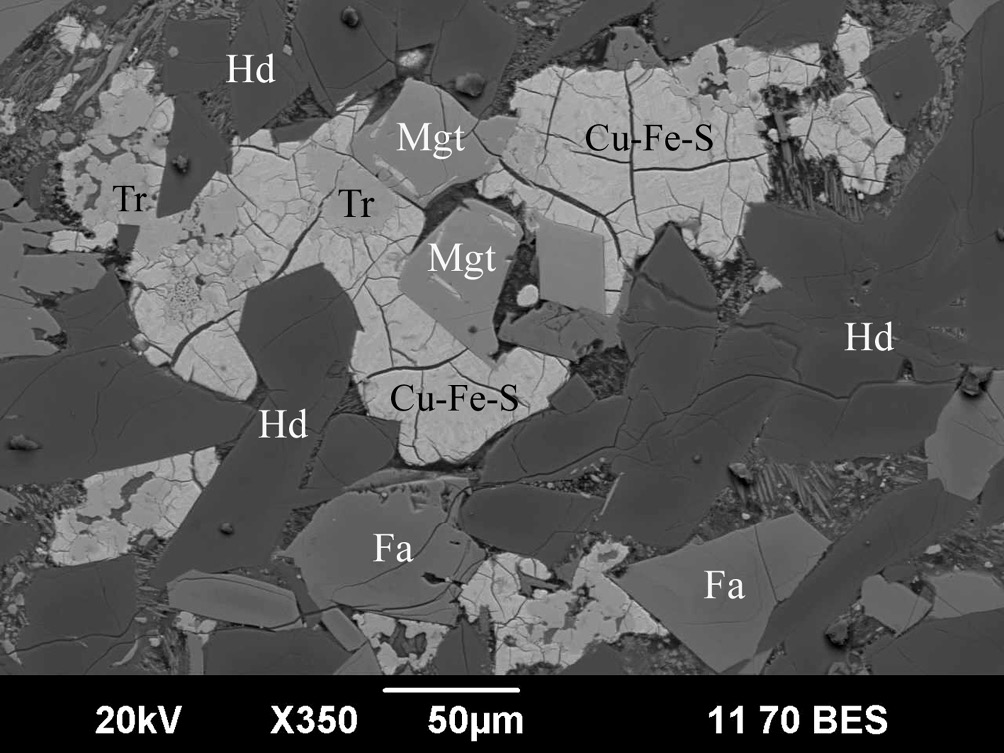 Сульфиды Cu-Fe-S также встречаются в интерстициях между кристаллами геденбергита и фаялита, где ассоциируют с троилитом, халькопиритом, реже с магнетитом. Они являются более поздними по сравнению с троилитом и халькопиритом, т. к. их обрамляют. По химическому составу сульфиды неоднородные и сильно варьируют по содержанию Cu и Fe (табл. 3, ан. 7–10). Наиболее железистые разности тяготеют к скоплениям троилита и халькопирита. Природные соединения с такими составами пока не обнаружены, хотя наиболее медистые разности приближаются к теоретическому составу борнита (табл. 3, ан. 10). Известны так называемые «расплавные твердые растворы» Cu1-xFe2+yS2-z, которые хорошо изучены экспериментально (Kosyakov, Sinyakova, 2014 и др.) и кристаллизуются в широком диапазоне температур от 1012 до 325ºС.