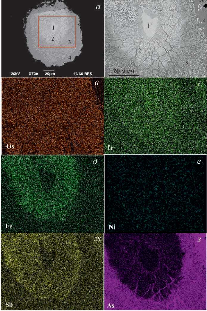 4. Fig. 3. Zoned secondary PGMs in primary iridium grain, a small relic of which is preserved in the central part. Zones: 1 – relict part of the grain; 2, 3 – corrosive minerals: 2 – thin subgraphic mixture of Fe-bearing iridium and tolovkite; 3 – fine-grained aggregate of iridium and irarsite; 4 – grain rim consisting of overprinted monolithic irarsite. General view (a) and detail of its central part (б), BSE images; elemental maps for Os (в), Ir (г), Fe (д), Ni (е), Sb (ж) and As (з).
