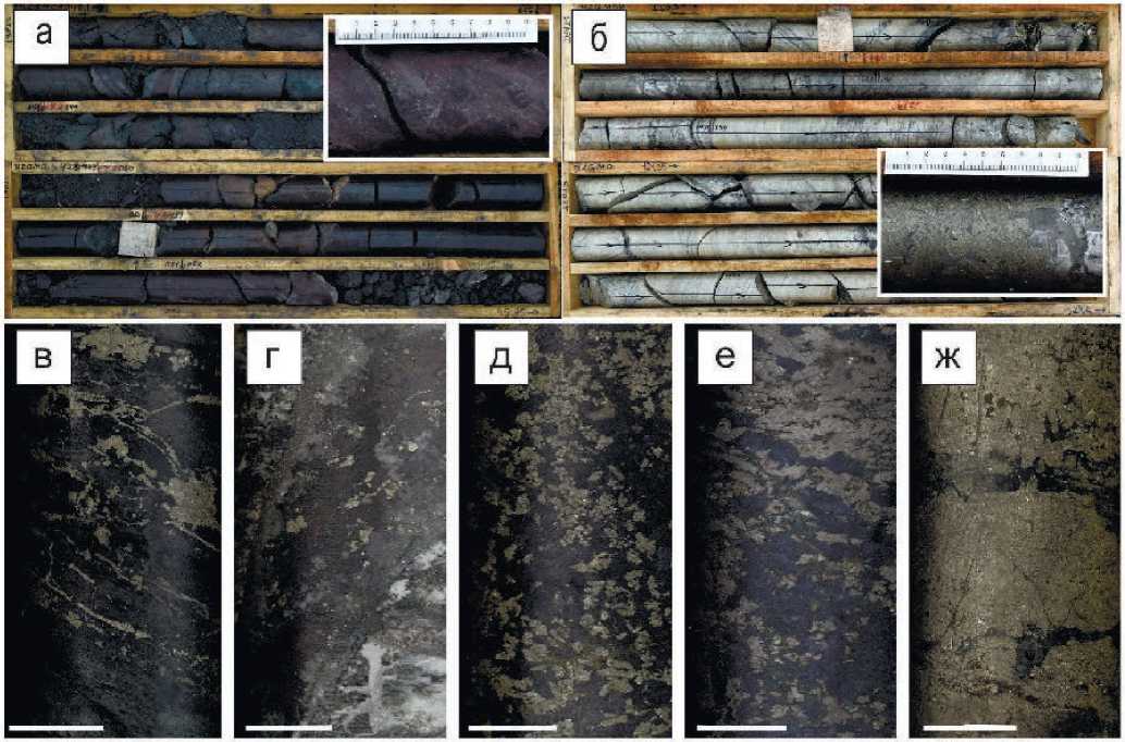 Fig. 4. Ores of the Nazarovskoe deposit: a – hematite; б – sulfide; ore textures: в – pocket-disseminated; г, д – stringer-disseminated; е, ж – massive. Scale bar for Figs. в-ж is 2 cm.