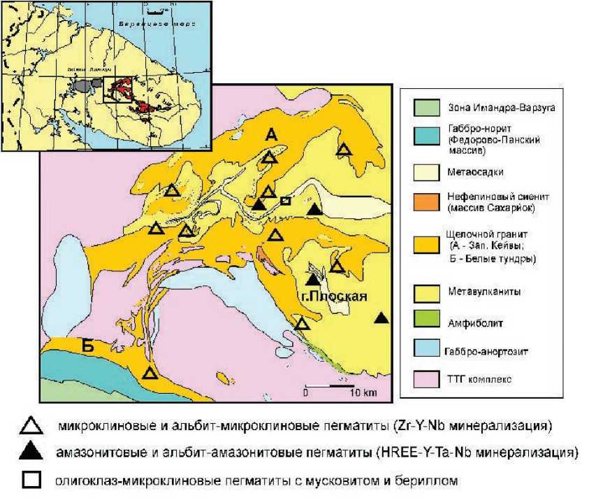 Олигоклаз-микроклиновые пегматиты с мусковитом размещены на значительном удалении от щелочных гранитов и интрудируют сланцевый (метаосадочный) комплекс Кейв (рис.1). Их генетическая связь со щелочными гранитами является маловероятной, о чем свидетельствует геологическая позиция, существенно микроклин-мусковитовый состав пегматитов, а также присутствие магнетита, титанита, берилла, монацита и ксенотима. Амазонитовые и альбит-амазонитовые пегматиты могут находиться как на удалении от щелочных гранитов (преимущественно в Кейвском гнейсовом (метавулканическом) комплексе), так и в приконтактовых частях массивов щелочных гранитов (рис. 1). Альбит-амазонитовые пегматиты содержат редкометалльную акцессорную минерализацию, сходную с таковой для щелочных гранитов (минералы редкоземельных элементов (REE), Nb, Ta). Микроклиновые пегматиты с астрофиллитом и альбит-микроклиновые пегматиты с эгирином приурочены к экзо- и эндоконтактовым частям массивов щелочных гранитов. Редкометалльные минералы в них могут быть второстепенными и представлены, главным образом, цирконом, фергусонитом-(Y), гадолинитом-(Y) и торитом.