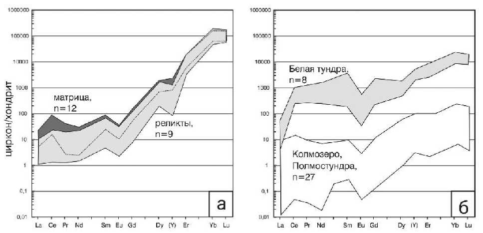 Суммарное содержание REE в реликтах ниже, чем в матрице, и составляет, в среднем, 19400 против 27400 г/т, соответственно (табл. 2). Средние содержания Y и некоторых тяжелых редких земель (HREE: Yb и Lu) имеют сходное соотношение: 19370 (15420, 2430) против 27390 (21740, 3140) г/т. Такие высокие концентрации HREE (с максимальными содержаниями 30150 г/т для Yb и 4350 г/т для Lu) в цирконе можно рассматривать как уникальные. В мире на данный момент известны только единичные сходные определения, характерные для относительно поздних (гидротермальных) участков в минерале из высокодифференцированных гранитов и пегматитов: например, гранитоидные комплексы Зудонг, Дабу, Ксинфенг в Южном Китае (Zhao et al., 2022; Wang et al., 2023), пегматиты (с амазонитом) Таками в Японии (Hoshino et al., 2010; Kakutani et al., 2012).