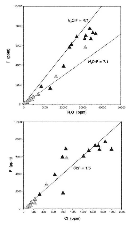 Fig. 8. Correlation of H2O, F and Cl contents in relics (gray triangles) and matrix (black triangles) of zircon from pegmatites of the Mt Ploskaya deposit.