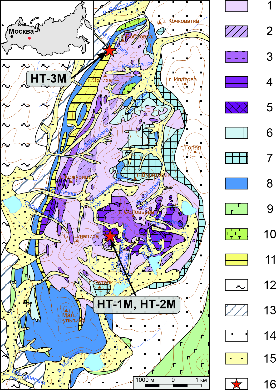 Рис. 1. Геологическая карта Нижнетагильского массива по данным (Иванов, 1997) с точками опробования миаролитовых дунитов (обр. НТ-1М), хромититов (обр. НТ-2М) и демантоидов из россыпи р. Бобровка (обр. НТ-3М). 1–5 – Дуниты: 1 – тонкозернистые; 2 – мелкозернистые; 3 – мелкозернистые перекристаллизованные; 4 – среднезернистые; 5 – крупнозернистые; 6 – верлиты и оливиновые клинопироксениты; 7, 8 – клинопироксениты: 7 – среднезернистые мономинеральные, магнетитсодержащие; 8 – мелкозернистые, оливин- и магнетитсодержащие, рекристаллизованные; 9 – тылаиты и плагиоклазсодержащие клинопироксениты; 10 – роговообманковое габбро; 11 – брусит-магнетит-антигоритовые и магнетит-антигоритовые серпентиниты; 12 – кварц-хлоритовые, кварц-серицитовые и углистые сланцы, песчаники, кварциты; 13 – хлорит-актинолитовые сланцы и порфиритоиды; 14 – роговики и кытлымиты по вулканогенно-осадочному субстрату; 15 – аллювиальные отложения и россыпи; 16 – точки отбора проб гранатов.
