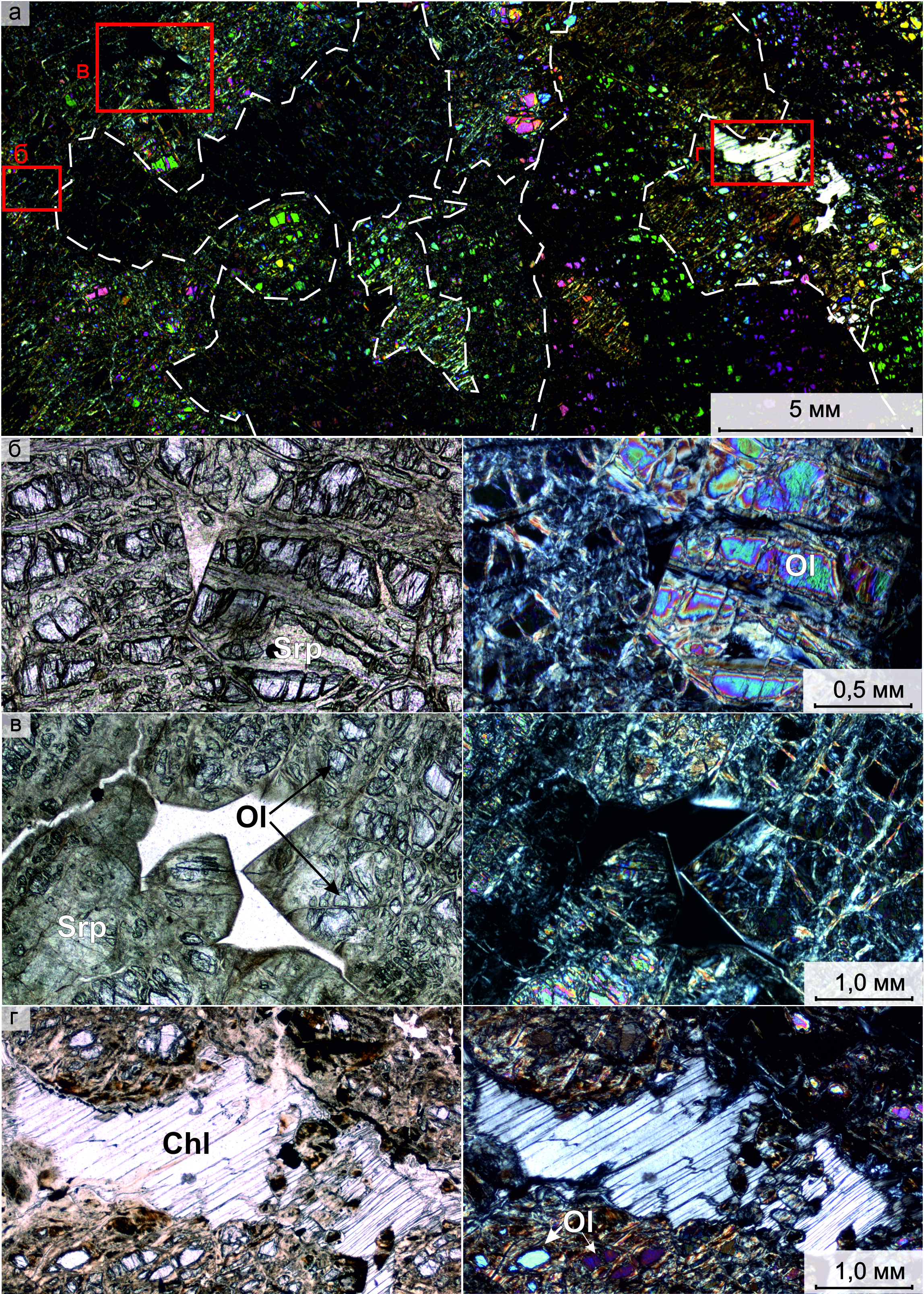 Fig. 3. Images of thin section of miarolitic dunite from the Nizhny Tagil massif: а – with analyzer (the boundaries of grains are marked by a white dotted line); б–г – fragments with voids (б, в) between olivine crystals (Ol), locally, filled with serpentine (Srp, б) or chlorite (Chl, г).