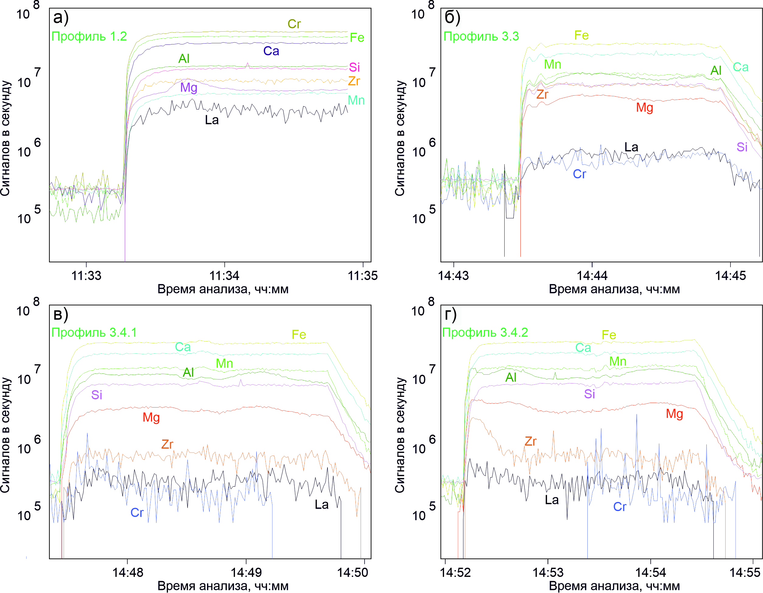 Анализ проводился с использованием точечного и линейного режимов абляции с диаметром пучка 55–80 мкм. Для удаления приповерхностных загрязнений перед каждым анализом выполнялась предварительная абляция продолжительностью 3 с. В течение первых 30 с регистрировался холостой сигнал без абляции вещества, затем в течение последующих 60 с обрабатывался сигнал от аблированного материала. Калибровка масс-спектрометра осуществлялась по эталонному международному стандартному образцу NIST SRM-612. При этом количество молекулярных оксидных ионов (232Th16O/232Th) не превышало 0.2 %. Соотношение 238U/232Th было близко к 1. Для расчета использовались международные референсные материалы SRM NIST-610 и SRM NIST-612. Для учета инструментального дрейфа лазера и масс-спектрометра стандартный образец анализировали через каждые 8– 12 точек. Расчет химического анализа проводился в программном комплексе Iolite (Paton et al., 2011) с применением стандартных подходов, описанных в (Longerich et al., 1996) и использованием в качестве внутреннего стандарта 29Si или нормализацией суммарного сигнала на 100 мас.%.