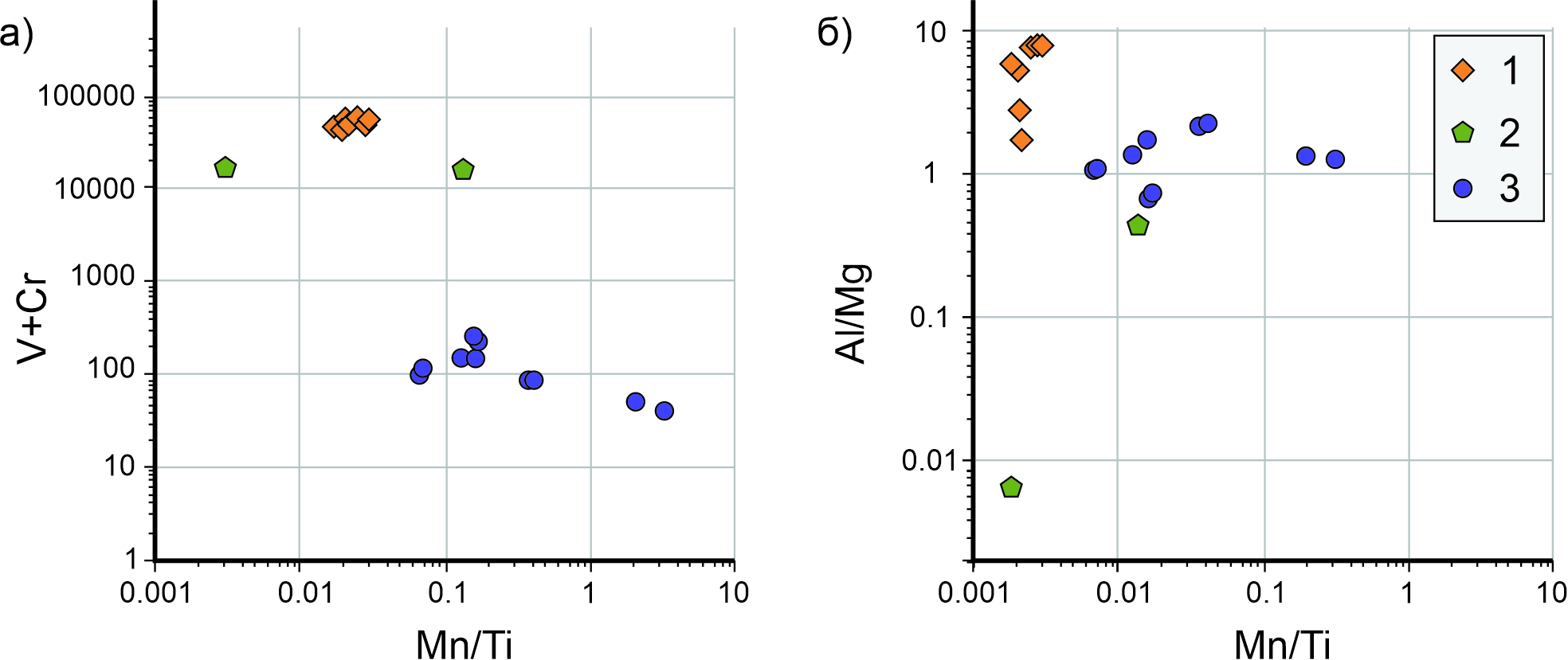 Кроме содержания и характера распределения РЗЭ, в качестве типоморфных признаков граната можно использовать содержание таких элементов, как V, Cr, Mn и Ti. На специфические условия формирования гранатов в миаролитовых дунитах косвенно указывает обособленное поле составов этих гранатов на диаграмме Al/Mg–Mn/Ti (рис 14), в то время как точки составов гранатов из хромититов и аподунитовых метасоматитов попадают в поля составов гранатов из других коренных месторождений демантоида (Уфалейское, Коркодинское, рис. 14а). Отдельно располагаются точки составов граната из родингитов Баженовского месторождения (рис. 14а) (Schwarzinger, 2019).