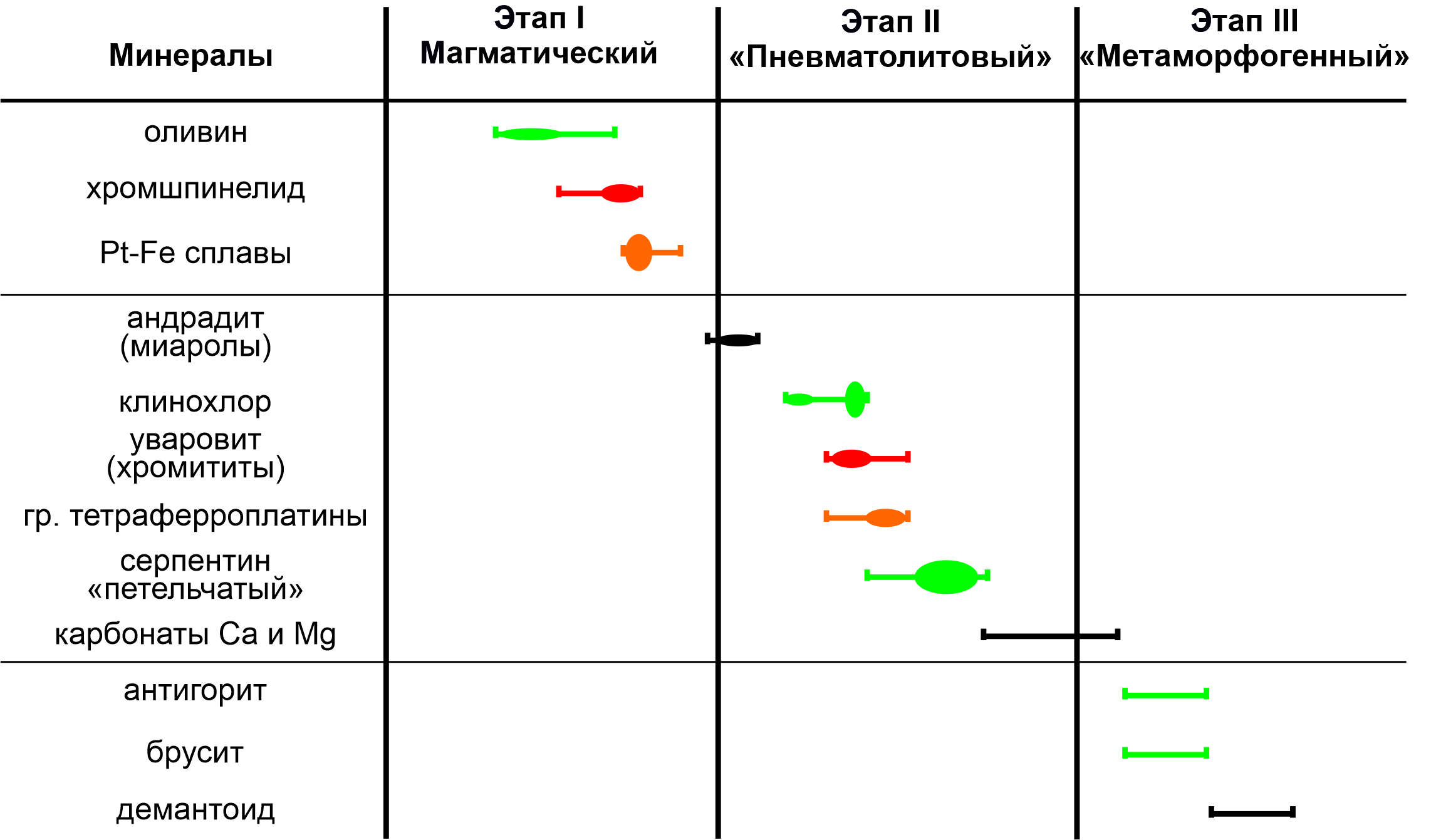 Рис. 12. Последовательность образования разных парагенезисов граната и других широко распространенных минералов в дунитах Нижнетагильского массива. Зеленое – оливин и замещающие его минералы; красное – хромшпинелид и замещающие его минералы; оранжевое – минералы платиновой группы.