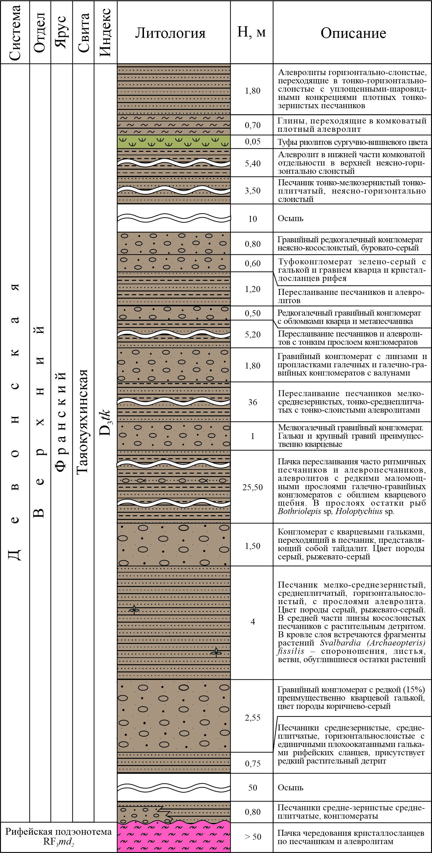 Fig. 3. Lithological column of cross-section of the Tayaokuyakha Formation (D3tk), Talyanayakha River, Bezymyanny Creek, Nemazyamayakha River, southwestern slope of the Kanin Kamen Range.