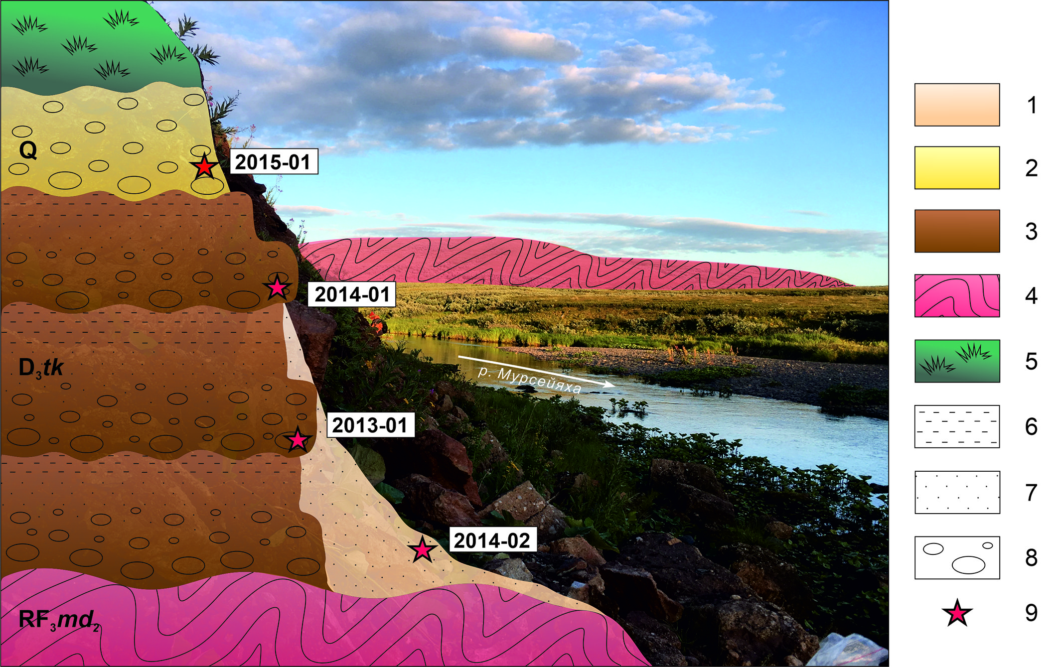 Рис. 5. Схематический разрез терригенных отложений с местами отбора шлиховых проб, р. Мурсейяха. 1 – современные аллювиальные отложения; 2 – консолидированные четвертичные терригенные отложения; 3 – терригенные отложения девонского возраста; 4 – метаморфизованные отложения докембрия; 5 – дерн; 6 – алевролит; 7 – песчаник; 8 – конгломерат; 9 – место отбора шлиховых проб.
