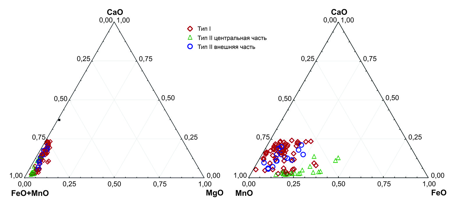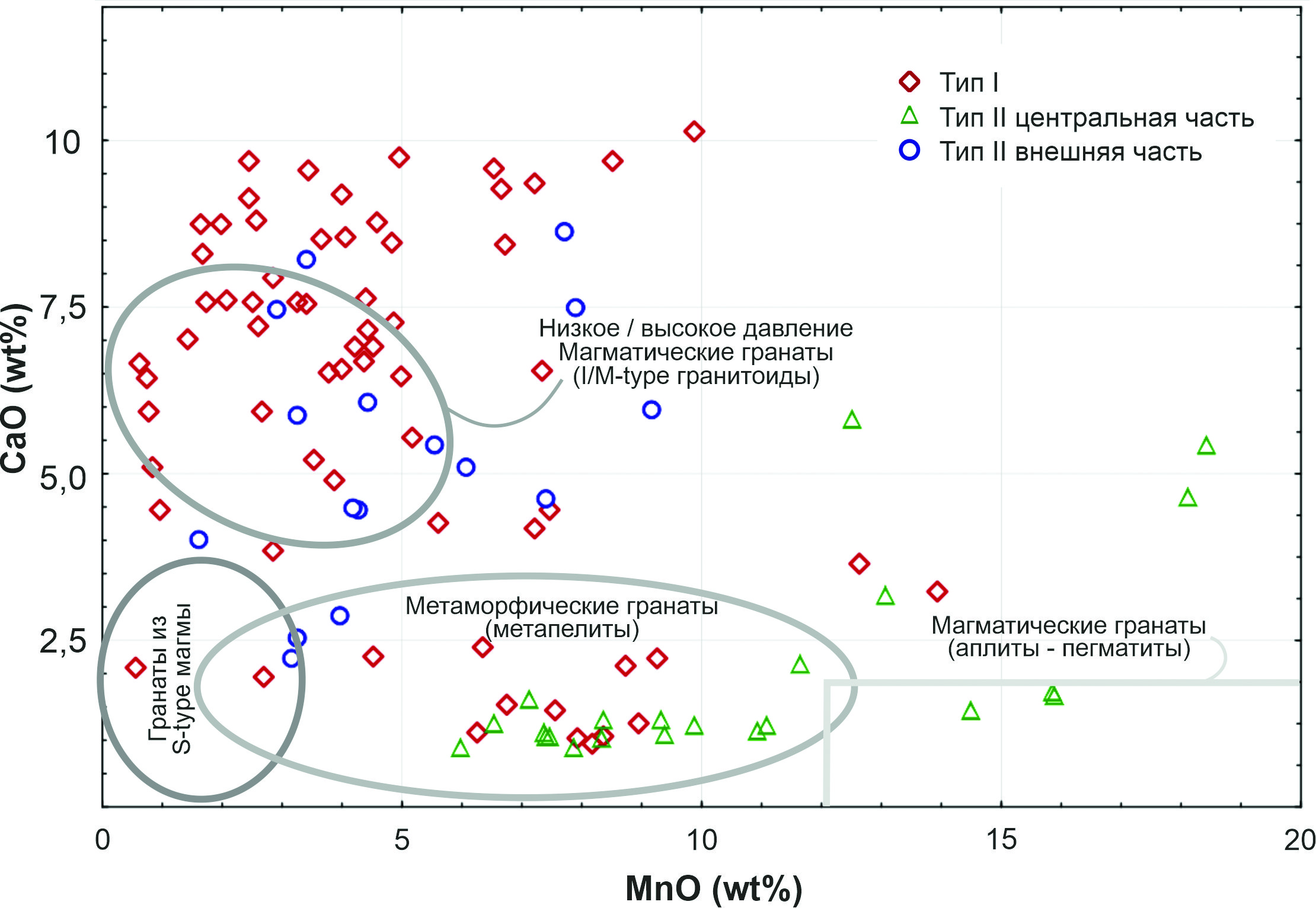 Несмотря на то, что все гранаты по составу принадлежат ряду альмандин–спессартин (табл. 3), однако на диаграмме MnO–CaO–FeO видны небольшие различия. Гранаты типа I и краевые части гранатов типа II имеют идентичный состав, тогда как центральные части гранатов типа II отличаются меньшим содержанием Ca при повышенном содержании Mn и Fe (рис. 10).