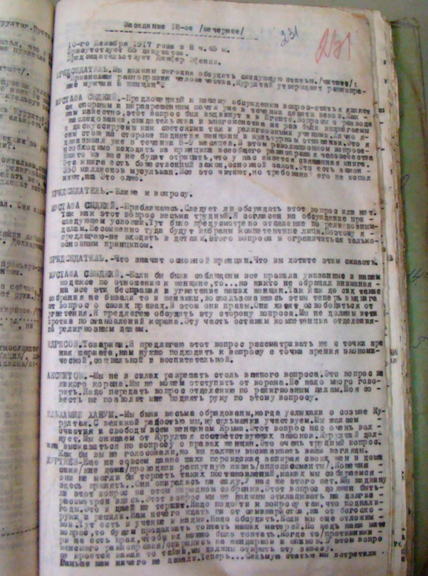 Самое интересное происходило уже во время Курултая, что подробно описано в третьем и четвертом протоколе стенограммы 18 и 19-го заседаний Курултая. Этот документ интересен тем, что анализ женского вопроса в данных протоколах ранее не проводили (Рис.3).