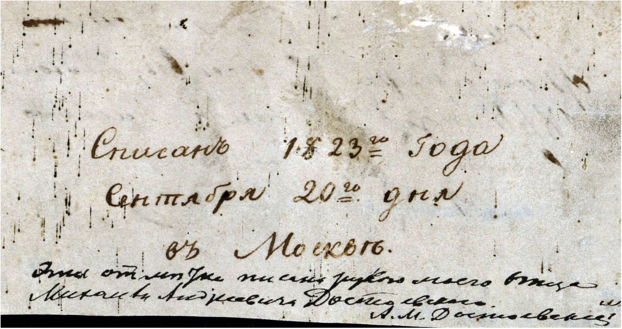 Fig. 3 . A memorial note by M. A. Dostoevsky (father of the writer), which was inserted into the frame of portraits of 1823. (Expla natory postscript by A. M. Dostoevsky). State Museum of the History of Russian Literature Named After V. I. Dahl