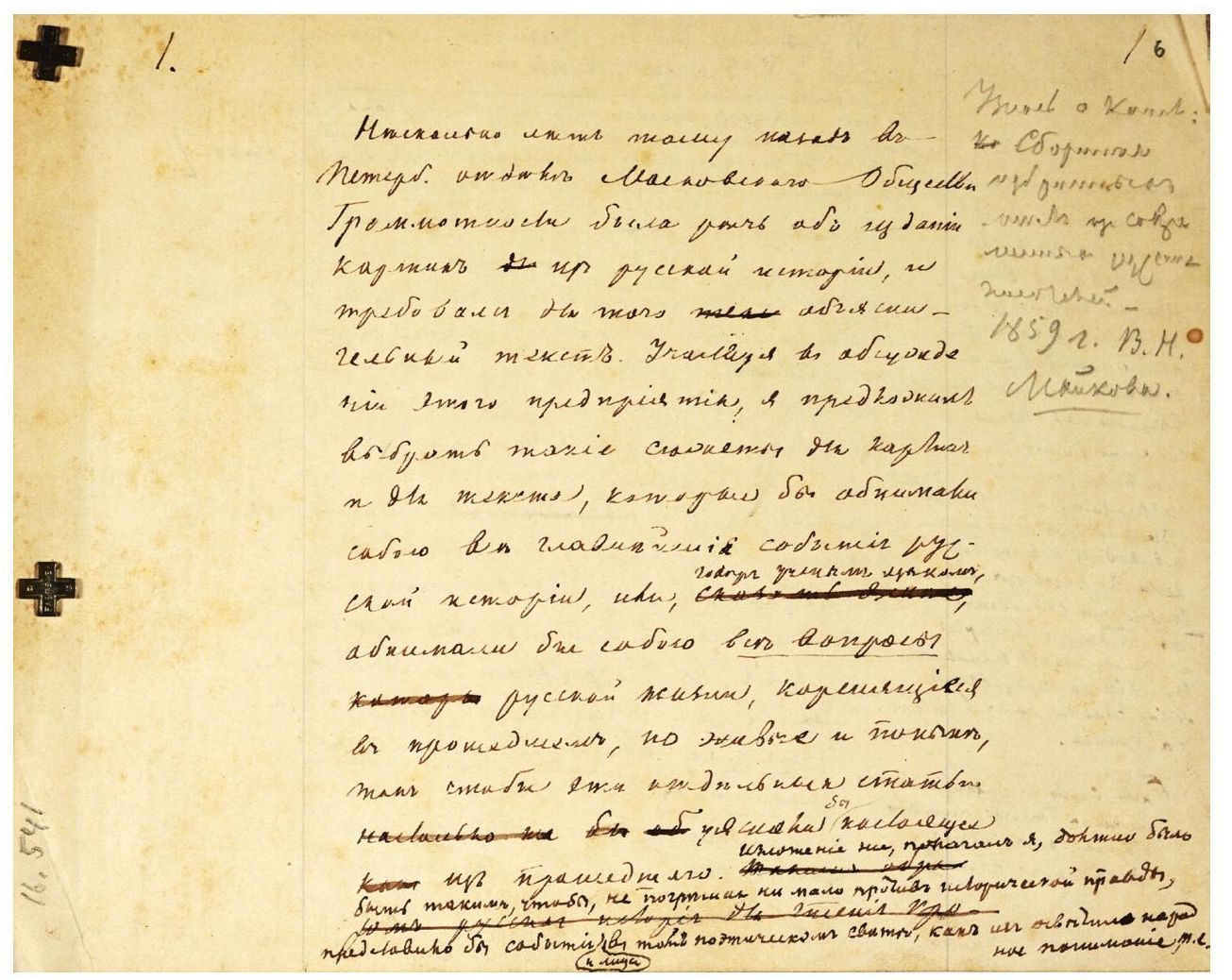 Очевидно, что первый план цикла исторической прозы написан ранее, чем письмо к другу. По всей вероятности, он составлен даже не в начале 1869-го, а в 1868 г. До апрельского сообщения Достоевскому о готовности к публикации четырех первых рассказов цикла Майков работал над их созданием отнюдь не пару месяцев. Он не писал быстро, а детально обдумывал и прорабатывал сюжеты, о чем свидетельствуют многочисленные правки в рукописях произведений поэта и наличие разных редакций35.