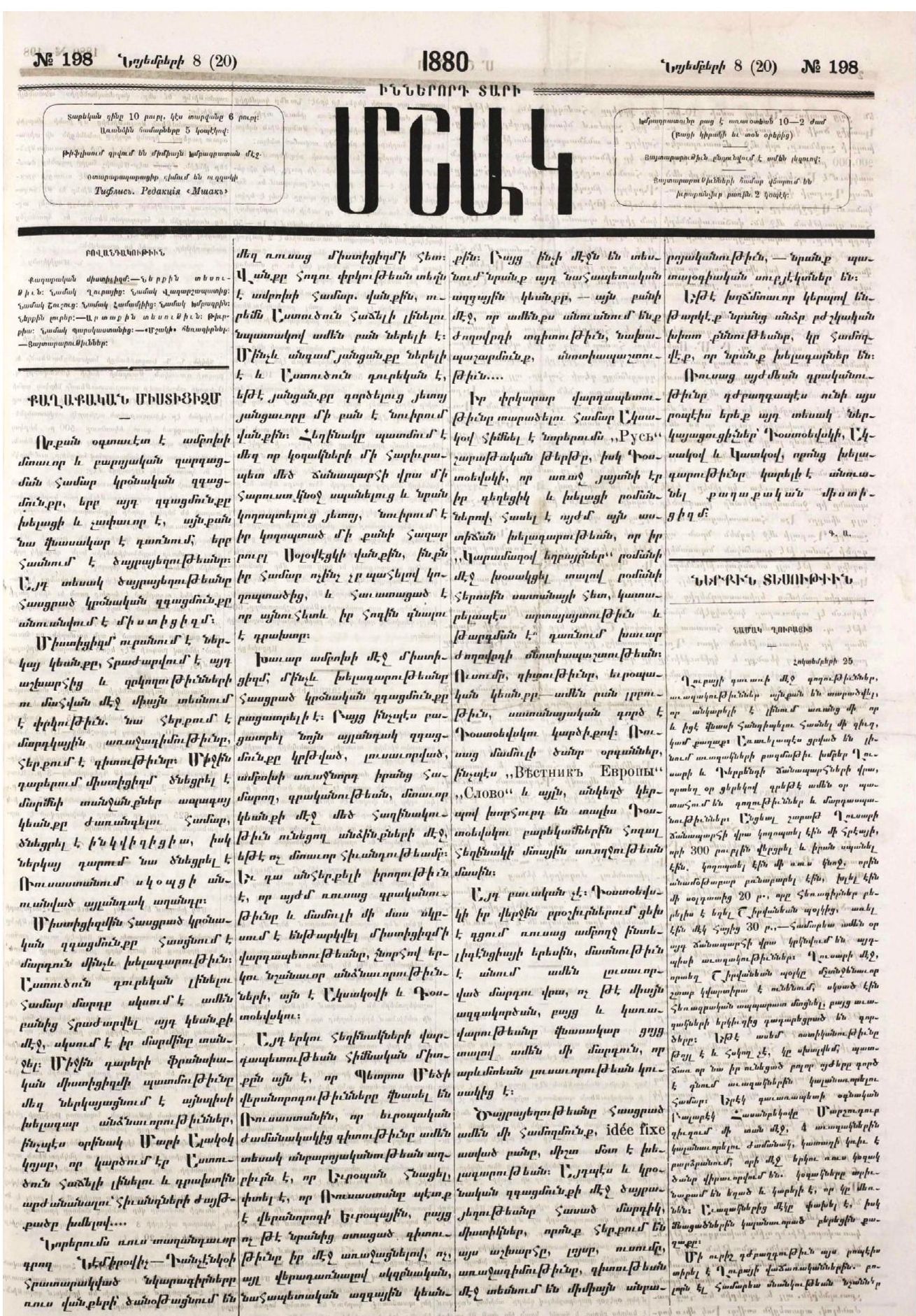 Fig. 1 . The first page of the newspaper “Mshak” (1880. No. 198) with G. Artsruni’s article “Political mysticism”