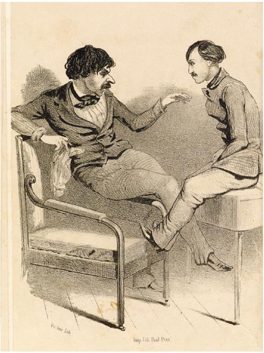 Fig. 4. Caricature by N. A. Stepanov on N. A. Nekrasov and I. I. Panaev. (“Illustrated Almanac,” 1848)