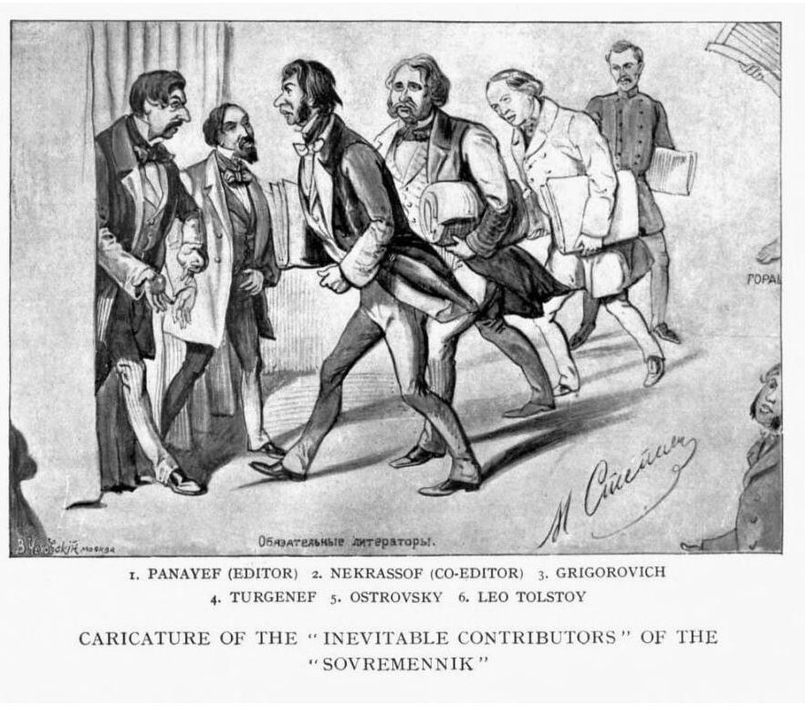 6. Fig. 5. I. I. Panaev, N. A. Nekrasov, D. V. Grigorovich, I. S. Turgenev, A. N. Ostrovsky, L. N. Tolstoy. (Caricature by N. A. Stepanov “Obligatory Writers,” 1857)