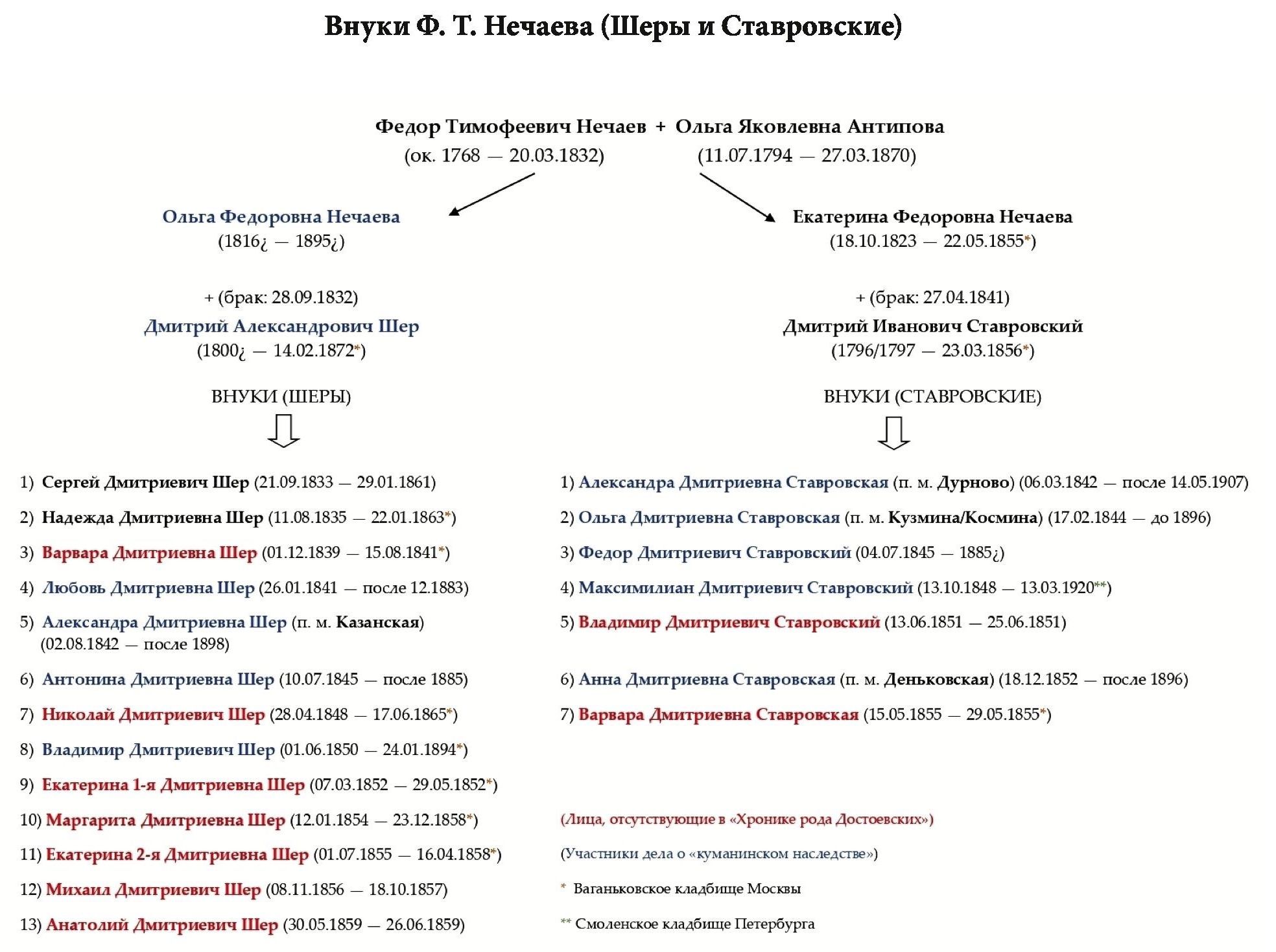 Через полгода после кончины дедушки Достоевского, 28 сентября 1832 г., «умершаго Московскаго Купца 3й гильдіи Федора Тимофеева Нечаева дочь дѣвица Ольга Федорова» будет выдана замуж «из дома Куманиных» за «вѣдомства Московской Дворцовой Конторы Губернскаго Секретаря Димитрія Александрова Шера». Венчание происходило в церкви Успения Пресвятой Богородицы, что в Печатниках, по месту жительства жениха (см.: [Дробышевская, Тихомиров: 61–62]). Младшая, Екатерина («тетка Катенька», как ее называли братья и сестры Достоевские), вышла замуж через девять лет после сестры, за «служащаго Репетиторомъ при Повивальномъ Институтѣ Императорскаго Московскаго Воспитательнаго Дома Медико-хирурга Коллежскаго Ассессора Дмитрiя Иванова сына Ставровскаго». Венчание также состоялось по месту жительства жениха — в церкви св. Тихона Амафунтского, что у Арбатских ворот (см.: [Дробышевская, Тихомиров: 64–65]). Оба этих брака были весьма обильны на детей: у четы Шер родилось тринадцать детей, у супругов Ставровских — семеро. Это были внуки Федора Тимофеевича Нечаева, но ему не суждено было с ними нянчиться: старший из них, Сергей Шер, родился через полтора года после кончины деда.
