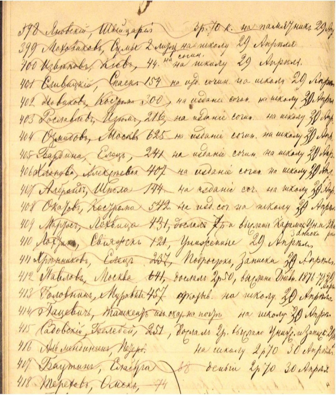 Записные книги и тетради издательницы являются уникальным материалом, расширяющим представление об истории главного дела вдовы великого писателя. В данных рукописных материалах лейтмотивом звучит признательность и глубокое почитание таланта Достоевского его современниками, о чем говорят многочисленные продажи, бесчисленные просьбы выдать сочинения в рассрочку, подарить или пожертвовать в пользу различных организаций, товариществ, библиотек (см. Илл. 3).