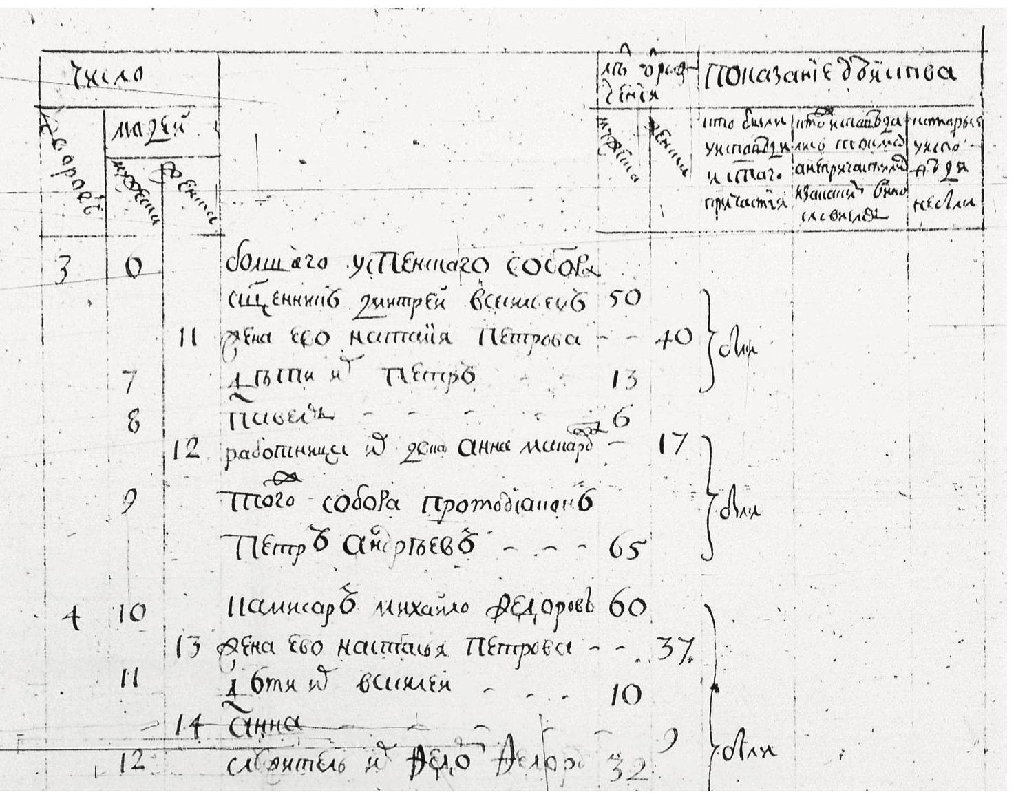 Немаловажно также указать, что сéмьи Димитрия Васильева и Михайлы Федорова, следуя в ведомости друг за другом, объединены в единой рубрике «Д<у>ховныя и ихъ домашния» (которую открывает семейство священника церкви Николая Чудотворца Алексея Никифорова). В этой рубрике четыре «двора»: двор «тояжъ церкви Дьячка михайлы андреева» № 2, двор «Болшаго Успенскаго Собора Священника Димитрія Васильева» № 3 и двор «камисара Михайлы Ѳедорова» № 4 (под № 5 записан «Домъ Его Сиятелства граѳа сергѣя павловича Якушинскаго»).