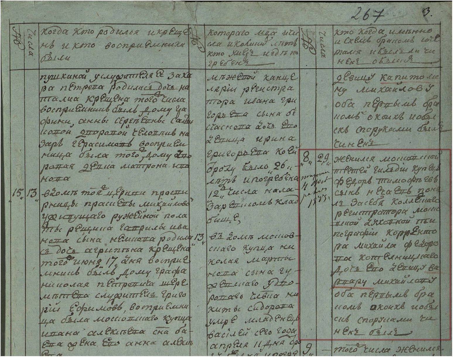 Так о каких же «московских корнях» родословной Достоевского может идти речь?6 В настоящей публикации предметом рассмотрения в первую очередь станет обзор документов, содержащих сведения о предках писателя по линии бабки (матери матери) Варвары Михайловны Котельницкой, с которой его дед, уже москвич, Федор Тимофеевич Нечаев, обвенчался 29 июля 1795 г. в церкви Живоначальной Троицы в Троицкой слободе. Бабушка Варвара, ее родители — Михаил Федорович и Настасья Петровна Котельницкие, а также два ее деда — Федор Андреев и Петр Андреев и прадед Андрей Григорьев с супругой Дарьей Кириловой, упоминания о которых встречаются в исторических документах на протяжении XVIII в. (а для старшего поколения — и в конце XVII в.), и составляют главную восходящую московскую ветвь генеалогического древа Федора Михайловича Достоевского.