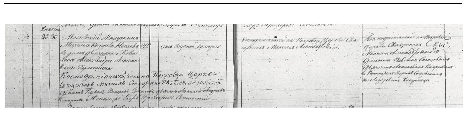162 Составители Хроники-2012, предположив, что в распоряжении Г. А. Федорова была «метрическая ведомость церквей Покровского [?] сорока», но, не обратившись к самому архивному документу, ошибочно назвали записи в консисторской книге «краткими сведениями о совершенных обрядах», противопоставив ей свой источник как «подлинную запись о бракосочетании» родителей Достоевского [Хроника: 94]. При сличении с воспроизводимым нами документом легко увидеть, что это не так.