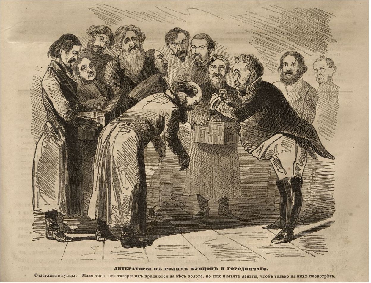 Сообщения об этом событии были напечатаны в нескольких столичных газетах2. Сатирический журнал «Искра» (1860. 6 мая. № 17) даже поместил на своей обложке выполненное в карикатурном ключе изображение одной из мизансцен этого спектакля («Литераторы в ролях купцов и городничего»; см. Илл. 1)3. В конце XIX — начале XX в., спустя несколько десятилетий, прошедших со дня постановки «Ревизора», о ней вспомнил ряд мемуаристов, как участников спектакля, так и зрителей (см.: [Вейнберг: 96–109], [Пантелеев, 1902], [Юнге: 240–241]). В 1964 г. в сокращенном виде воспоминания П. И. Вейнберга, одного из организаторов постановки, исполнителя роли Хлестакова, наиболее подробно описавшего это событие, были включены в составленный А. С. Долининым 2-томник «Ф. М. Достоевский в воспоминаниях современников» [Достоевский в воспоминаниях: 330–336].