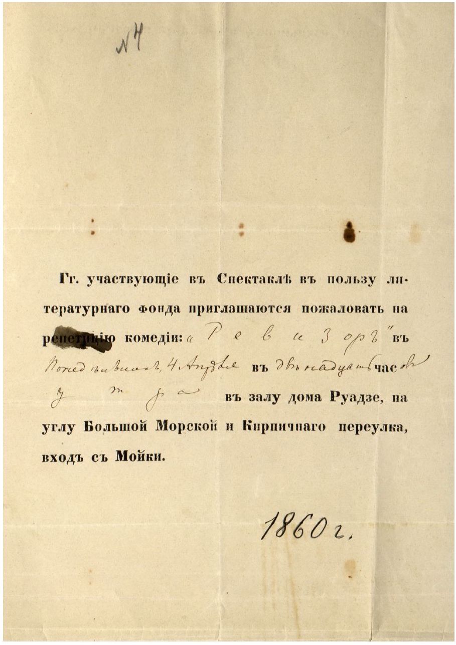 В 1973 г. в 86-м томе «Литературного наследства» Г. Ф. Коган обнародовала найденную ею в архиве Достоевского «повестку», которой писатель приглашался «на репетицiю комедiи: “Ревизоръ” въ Понедѣльникъ, 4 Апрѣля въ двенадцать часовъ утра въ залу дома Руадзе» (цит. по: [Коган: 14]; см. Илл. 2)4. Наконец, в 1980 г. Г. В. Степанова опубликовала письмо П. И. Вейнберга от конца марта 1860 г., в котором он, уведомленный А. Ф. Писемским о согласии Достоевского принять участие в постановке «Ревизора», предлагает ему на выбор оставшиеся после распределения роли Шпекина, Добчинского или Хлопова (см.: [Степанова: 242–243]). Как известно, Достоевский выбрал роль почтмейстера Шпекина, которую и исполнил, по оценке Вейнберга, блестяще.