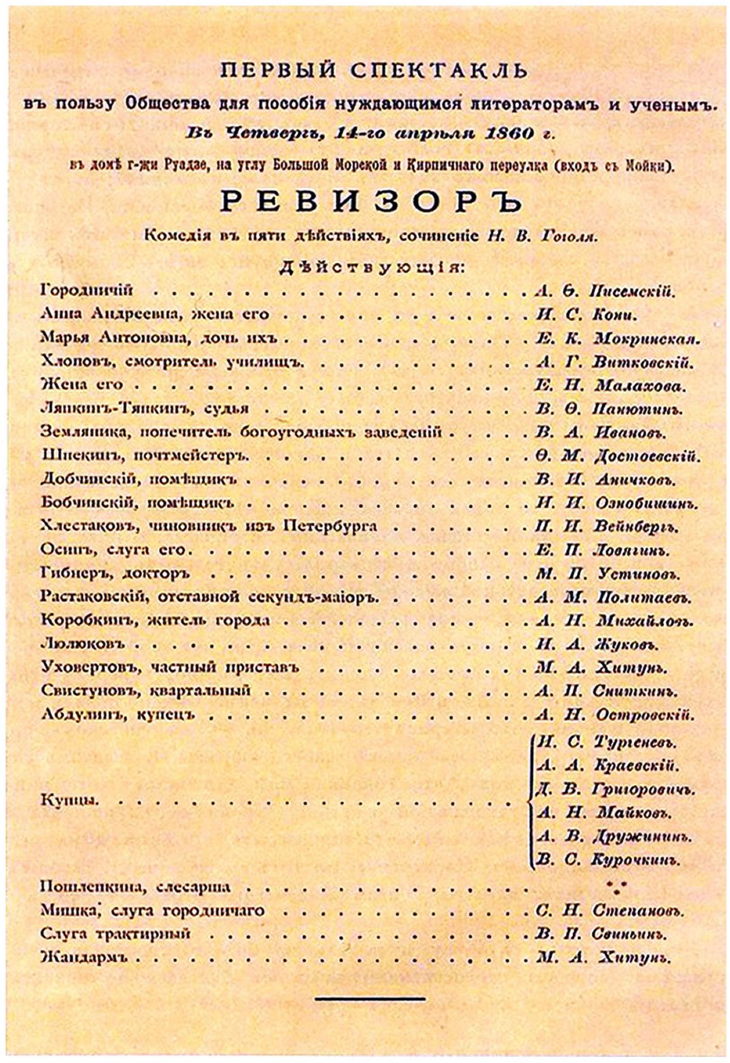 Судя по всему, составитель энциклопедического словаря в качестве источника использовал сокращенную перепечатку воспоминаний П. И. Вейнберга11, опубликованных в 1895 г. в «Ежегоднике императорских театров», которая была включена в 2-томник воспоминаний о Достоевском 1964 г. Однако в первой публикации текста Вейнберга в качестве иллюстрации была приведена афиша постановки «Ревизора» 14 апреля 1860 г., и благодаря этому мы знаем всех участников спектакля (см.: [Вейнберг: 105]).