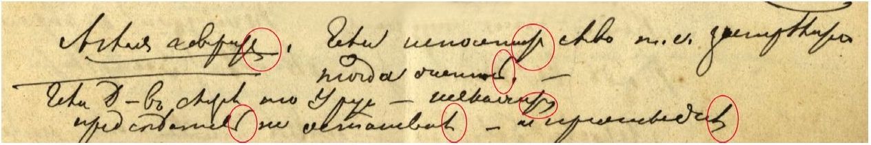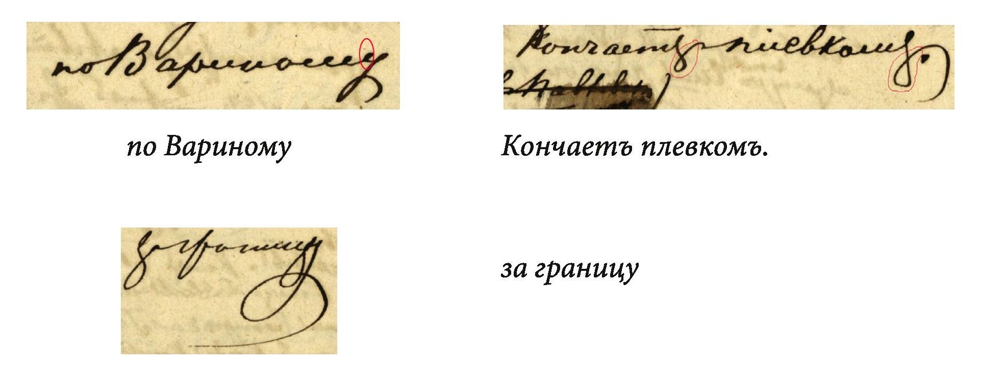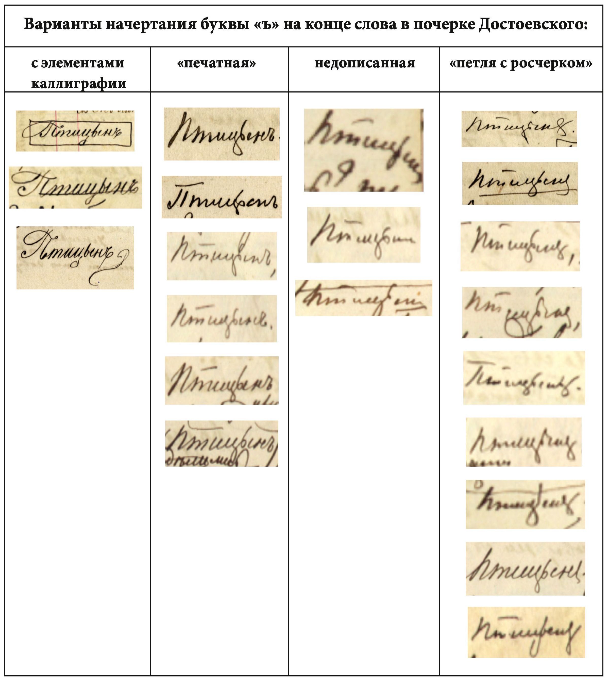 При различении подобных форм достаточно надежной опорой может послужить также одна устойчивая индивидуальная особенность их написания, характерная для почерка Достоевского: не дописываются, «съедаются» обычно только окончания с последней гласной буквой — в глаголах это формы 2–3 лица (на -ете, -етъ); слова же, заканчивающиеся мягким знаком, в частности — инфинитивные формы, обычно прописываются полностью, причем с весьма характерным начертанием мягкого знака, которое сложно спутать с личными формами глагола, — это «высокий вертикальный штрих (выше линии строки), выписанный с наклоном вправо и, в ряде случаев, с завитком на конце (иногда с росчерком пера)» [Тарасова, Заваркина, Панюкова: 58].